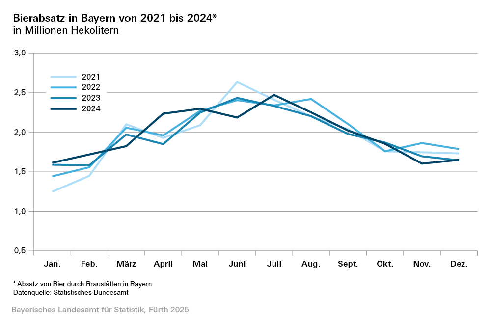 Über das Jahr betrachtet war der höchste Bierabsatz der bayerischen Brauereien in den Monaten Mai (2,3 Millionen Hektoliter), Juli (2,5 Millionen Hektoliter) und August (2,3 Millionen Hektoliter) zu verzeichnen. Die stärksten Zunahmen im Bierabsatz 2024 verglichen mit dem jeweiligen Vorjahresmonat weisen die Monate April (+20,8 Prozent) und Februar (+8,7 Prozent) auf.
