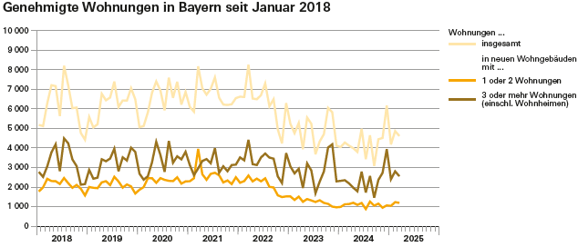 Von Januar bis März 2025 werden in Bayern insgesamt 13 666 Baugenehmigungen für Wohnungen erteilt. Nach Auskunft des Bayerischen Landesamts für Statistik steigt das Genehmigungsvolumen im Vergleich zum ersten Quartal 2024 um 9,8 Prozent beziehungsweise 1 218 Wohnungen.