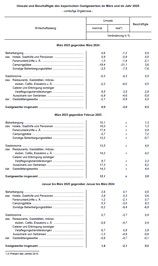 Gegenüber dem Februar 2025 steigt der nominale Umsatz des bayerischen Gastgewerbes im März 2025 um 12,1 Prozent und die Zahl der Beschäftigten um 3,0 Prozent.