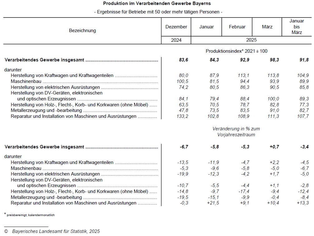 Nach Angaben des Bayerischen Landesamts für Statistik verzeichnet die Produktion des Verarbeitenden Gewerbes in Bayern im März 2025 eine leichte Zunahme von 0,7 Prozent gegenüber dem Vorjahresmonat. Das erste Quartal des Jahres 2025 ergibt ein Minus von 3,4 Prozent.