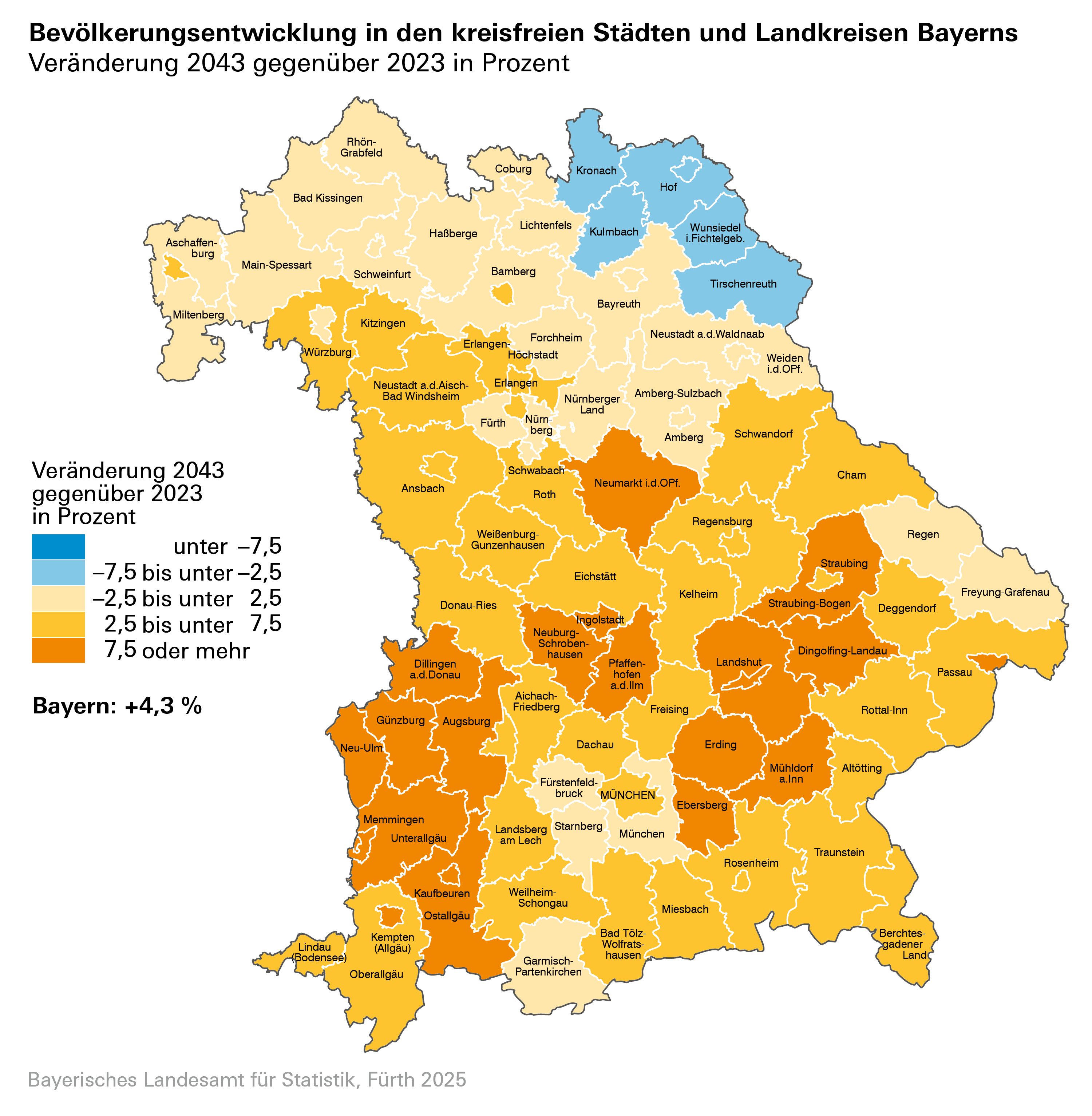 Aufgrund der anhaltend hohen Wanderungsgewinne der vergangenen Jahre konnte der Regierungsbezirk Niederbayern seine Einwohnerzahl nicht nur halten, sondern einen Zuwachs verzeichnen, der sich in Zukunft voraussichtlich fortsetzen wird. Für Niederbayern wird eine Zunahme um 6,4 Prozent oder etwa 80 000 Einwohner erwartet (2023: 1,25 Millionen; 2043: 1,33 Millionen).