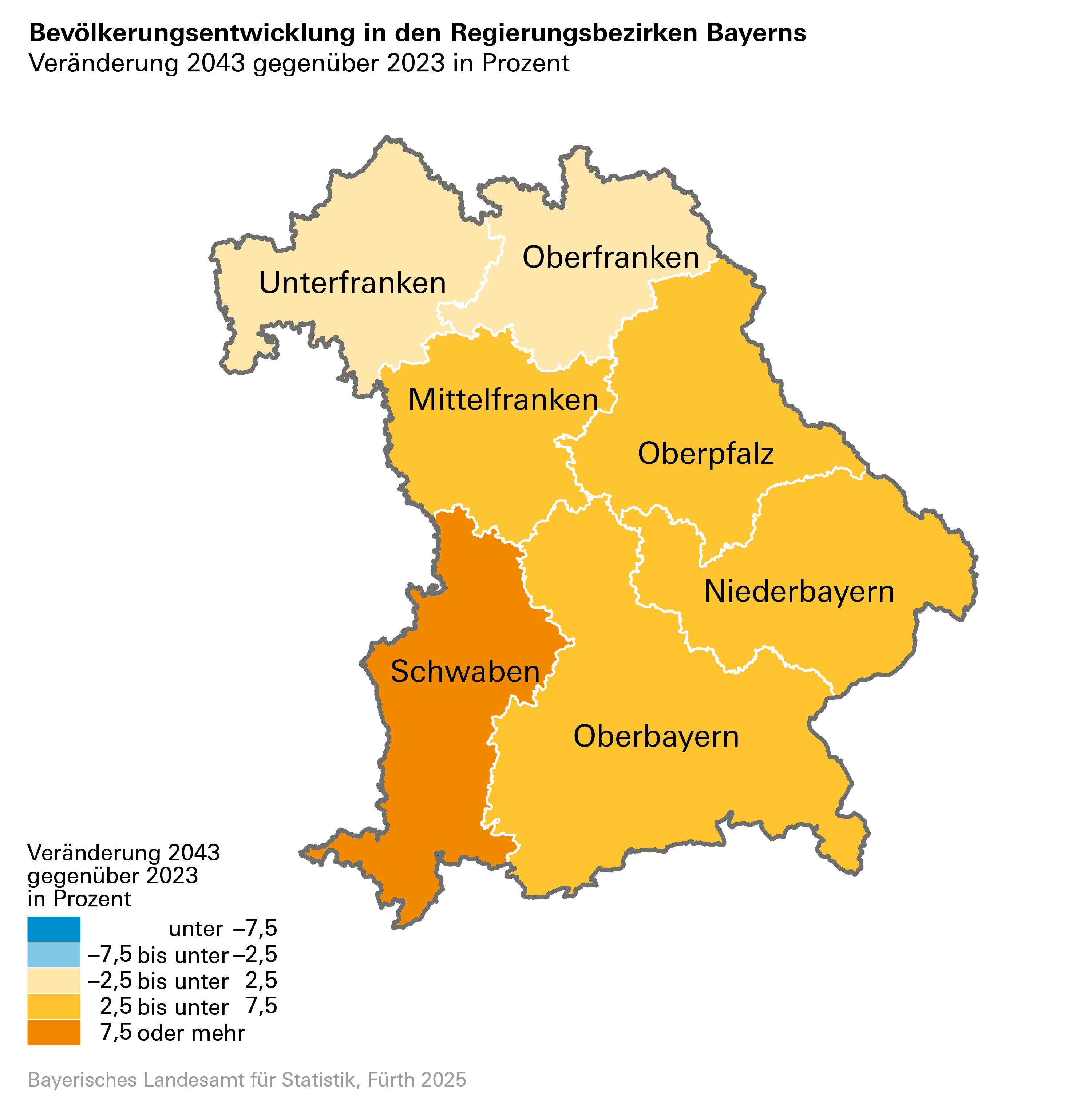 Nach der aktuellen Vorausberechnung steigt die Bevölkerungszahl Schwabens bis zum Jahr 2043 um etwa 156 000 Personen auf 2,08 Millionen Einwohner an. Ausgehend von 1,92 Millionen Personen Ende 2023 entspricht das einem Plus von 8,1 Prozent und damit dem stärksten prozentualen Bevölkerungszuwachs unter den Regierungsbezirken des Freistaats. Aufgrund der anhaltend hohen Wanderungsgewinne verzeichnet der Regierungsbezirk Schwaben einen deutlichen Zuwachs, der sich in Zukunft voraussichtlich fortsetzen wird.