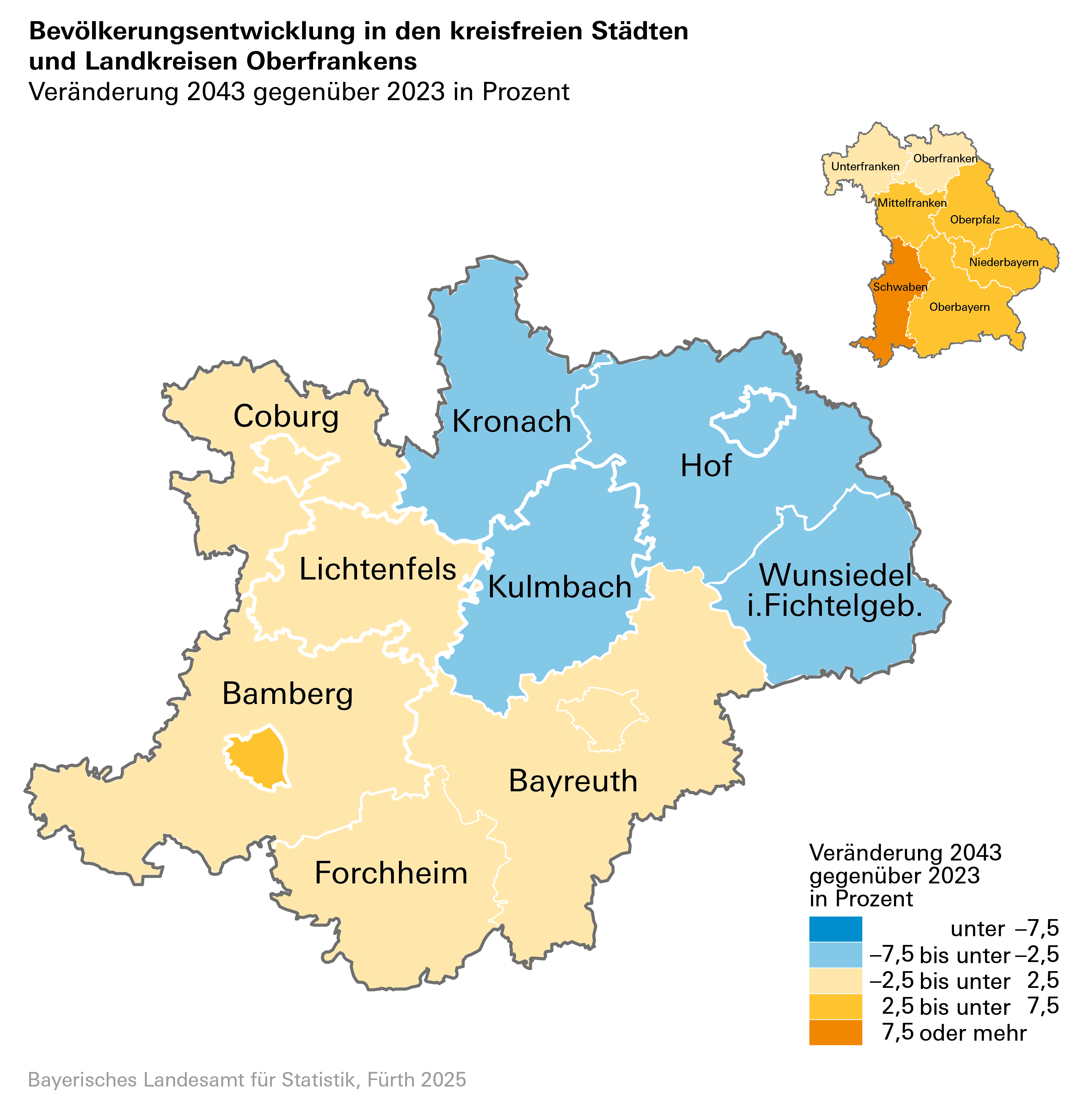 Für die Stadt Bayreuth (+0,7 Prozent) sowie die Landkreise Bamberg (+1,5 Prozent) und Forchheim (+1,4 Prozent) wird mit einer beständigen Bevölkerungsentwicklung unter positivem Vorzeichen gerechnet. Auch können zum Beispiel die Landkreise Coburg (-1,1 Prozent) und Bayreuth (-1,4 Prozent) angesichts nur leicht sinkender Bevölkerungszahlen eine noch stabile Entwicklung erwarten. Ein deutlicher Anstieg der Einwohnerzahlen wird für die kreisfreie Stadt Bamberg (+3,7 Prozent), stärkere Bevölkerungsrückgänge werden dagegen in erster Linie in den grenznahen Landkreisen vorausberechnet.