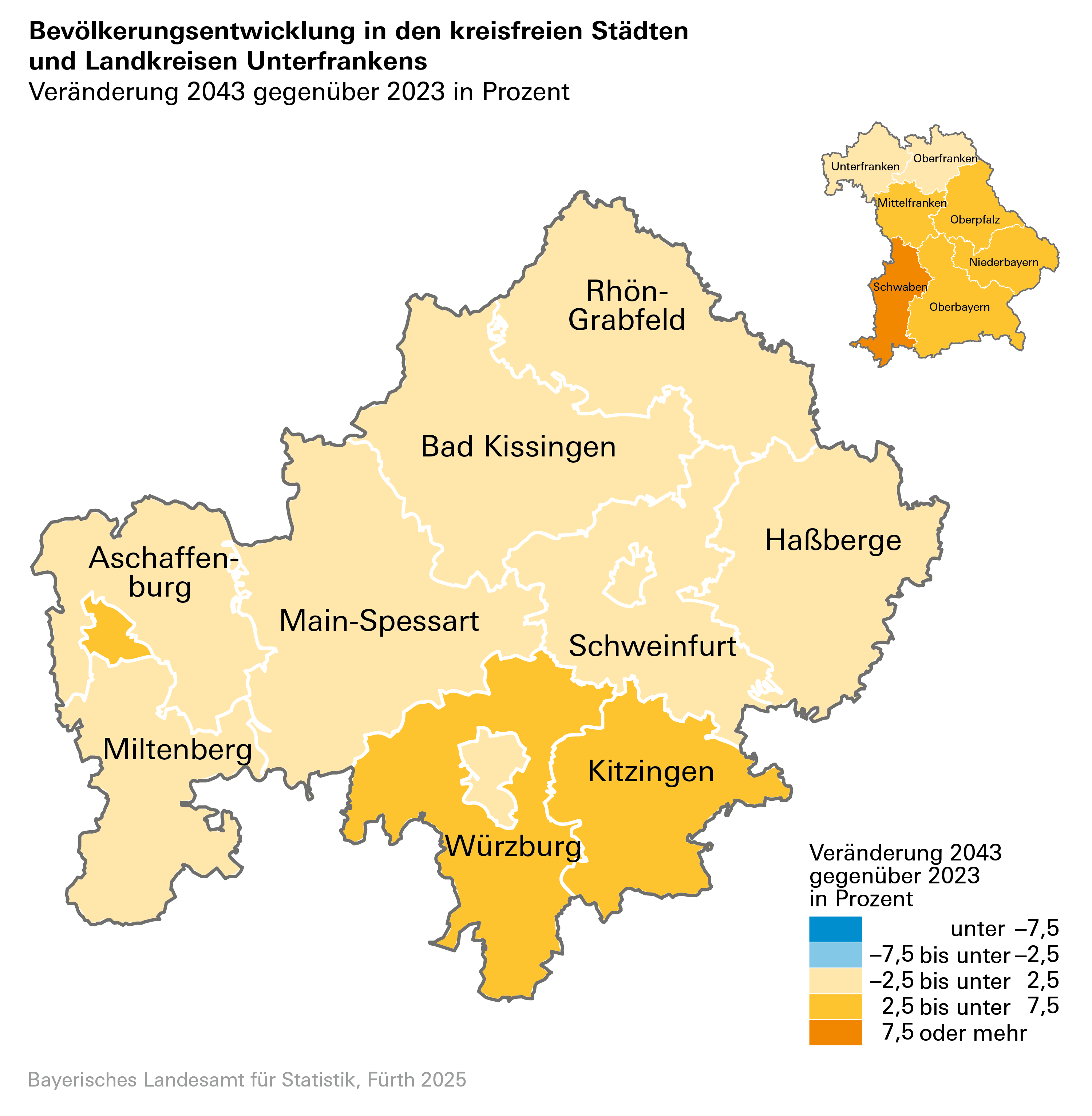 Die in Zukunft insgesamt stabile Bevölkerungsentwicklung wird vor allem von den Landkreisen Kitzingen (+6,1 Prozent) und Würzburg (+4,1 Prozent) sowie der kreisfreien Stadt Aschaffenburg (+2,9 Prozent) getragen. Leichte Bevölkerungsverluste werden dagegen in den nördlicheren Landkreisen nahe der Landesgrenze zu verzeichnen sein.