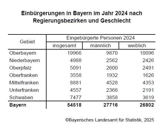 26 802 Frauen, die deutsche Staatsbürgerschaft. Dies sind nach Mitteilung des Bayerischen Landesamts für Statistik 18 415 Personen mehr als im Jahr 2023 und stellt einen neuen Höchstwert dar. Mit 9 351 Eingebürgerten und einem Anteil von 17,2 Prozent stellen Personen aus Syrien das dritte Jahr in Folge die größte Gruppe dar. Aufgrund der hohen Zahl an ausländischen Personen in den Großstädten München, Nürnberg und Augsburg verzeichnen die Regierungsbezirke Oberbayern (19 966), Mittelfranken (8 881) und Schwaben (7 477) die meisten Einbürgerungen.