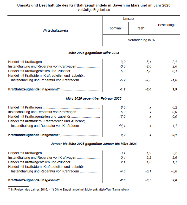 Laut einer Mitteilung des Bayerischen Landesamts für Statistik nach den vorläufigen Ergebnissen der „Monatsstatistik im Kfz-Handel (einschl. Instandhaltung und Reparatur von Kfz)“ nimmt der nominale Umsatz im bayerischen Kfz-Handel im ersten Quartal 2025 gegenüber dem Vorjahreszeitraum um 2,0 Prozent ab, nach Preisbereinigung sinkt der (reale) Umsatz um 3,5 Prozent. Die Zahl der Beschäftigten wächst um 2,0 Prozent.