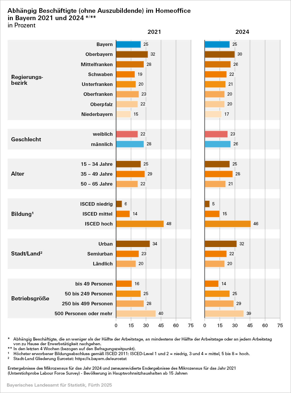 Auf Ebene der bayerischen Regierungsbezirke hat Oberbayern mit der Landeshauptstadt München mit 30 Prozent die höchste Homeoffice-Quote. In Niederbayern arbeiten die wenigsten Beschäftigten aus dem Homeoffice heraus. Die Quote liegt hier bei 17 Prozent. Die Regierungsbezirke Mittelfranken (26 Prozent), Schwaben (22 Prozent), Unterfranken (21 Prozent) sowie Oberfranken und die Oberpfalz liegen mit jeweils 20 Prozent Homeoffice-Quote dazwischen. Die Unterschiede dürften größtenteils auf strukturelle Faktoren zurückzuführen sein.