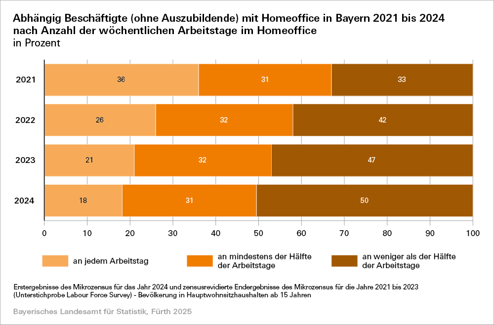 Nach Angaben des Fachteams im Bayerischen Landesamt für Statistik arbeiten im Jahr 2024 insgesamt gut 1,5 Millionen der knapp 6,3 Millionen abhängig Beschäftigten in Bayern mindestens einen Tag in der Woche im Homeoffice. Das sind gut 25 Prozent. Der Anteil der Beschäftigten, die ausschließlich im Homeoffice arbeiten, ist dabei rückläufig. Während im Corona-Jahr 2021 mit 36 Prozent gut ein Drittel der Beschäftigten ausschließlich im Homeoffice gearbeitet hat, reduziert sich dieser Anteil nach aktuellen Ergebnissen im Jahr 2024 auf 18 Prozent. Dabei geht insbesondere die Anzahl der Tage pro Woche, die im Homeoffice gearbeitet werden, deutlich zurück.