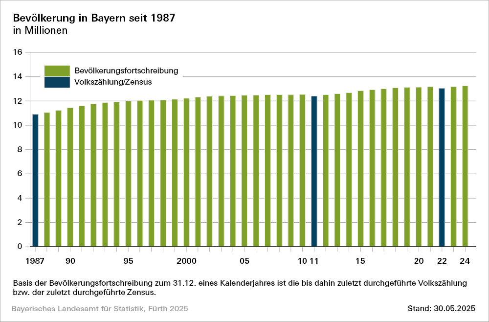 Wie das Bayerische Landesamt für Statistik mitteilt, leben nach den aktuellen Ergebnissen der Bevölkerungsfortschreibung am 31. Dezember 2024 rund 13,25 Millionen Menschen in Bayern. Gegenüber dem Bevölkerungsstand Ende 2023 wächst Bayern damit um rund 72 500 Personen. Das entspricht einem relativen Zuwachs von 0,6 Prozent.