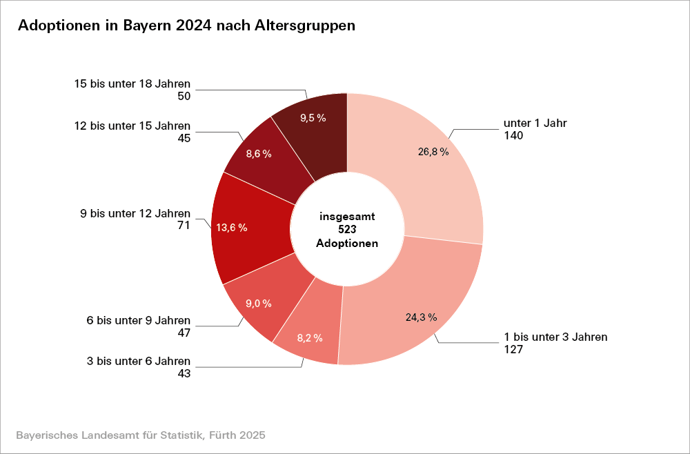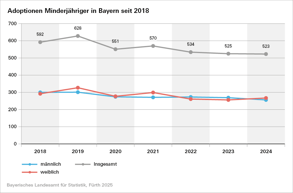 Nach Angaben des Bayerischen Landesamts für Statistik finden 2024 in Bayern 523 Adoptionen statt. Im Vergleich zum Vorjahr erfolgt ein Rückgang der Adoptionen um 0,4 Prozent. Das Geschlechterverhältnis ist dabei relativ ausgewogen. Der Großteil der Kinder und Jugendlichen wird durch einen Stiefelternteil adoptiert. Mehrheitlich sind die Kinder zum Zeitpunkt der Adoption jünger als drei Jahre. Mit 92,0 Prozent verfügt eine Vielzahl der Adoptierten über die deutsche Staatsbürgerschaft.