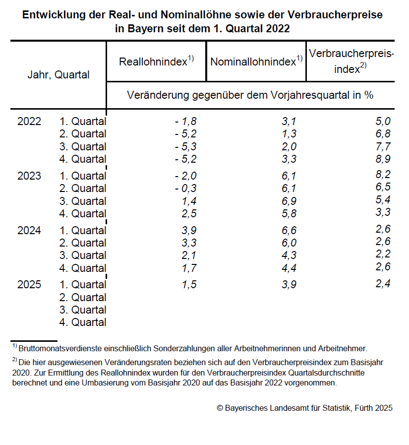 Die Nominallöhne der Arbeitnehmerinnen und Arbeitnehmer in Bayern steigen im ersten Quartal 2025 um durchschnittlich 3,9 Prozent gegenüber dem Vorjahresquartal. Dies ist der schwächste Nominallohnanstieg für die bayerischen Beschäftigten seit dem vierten Quartal 2022. Die Verbraucherpreise nehmen im selben Zeitraum um 2,4 Prozent zu. Wie das Fachteam im Bayerischen Landesamt für Statistik weiter mitteilt, errechnet sich für die Reallöhne im Freistaat im ersten Quartal des Jahres 2025 ein Zuwachs um 1,5 Prozent. Damit setzt sich die positive Entwicklung der Reallöhne seit dem dritten Quartal 2023 weiter fort.