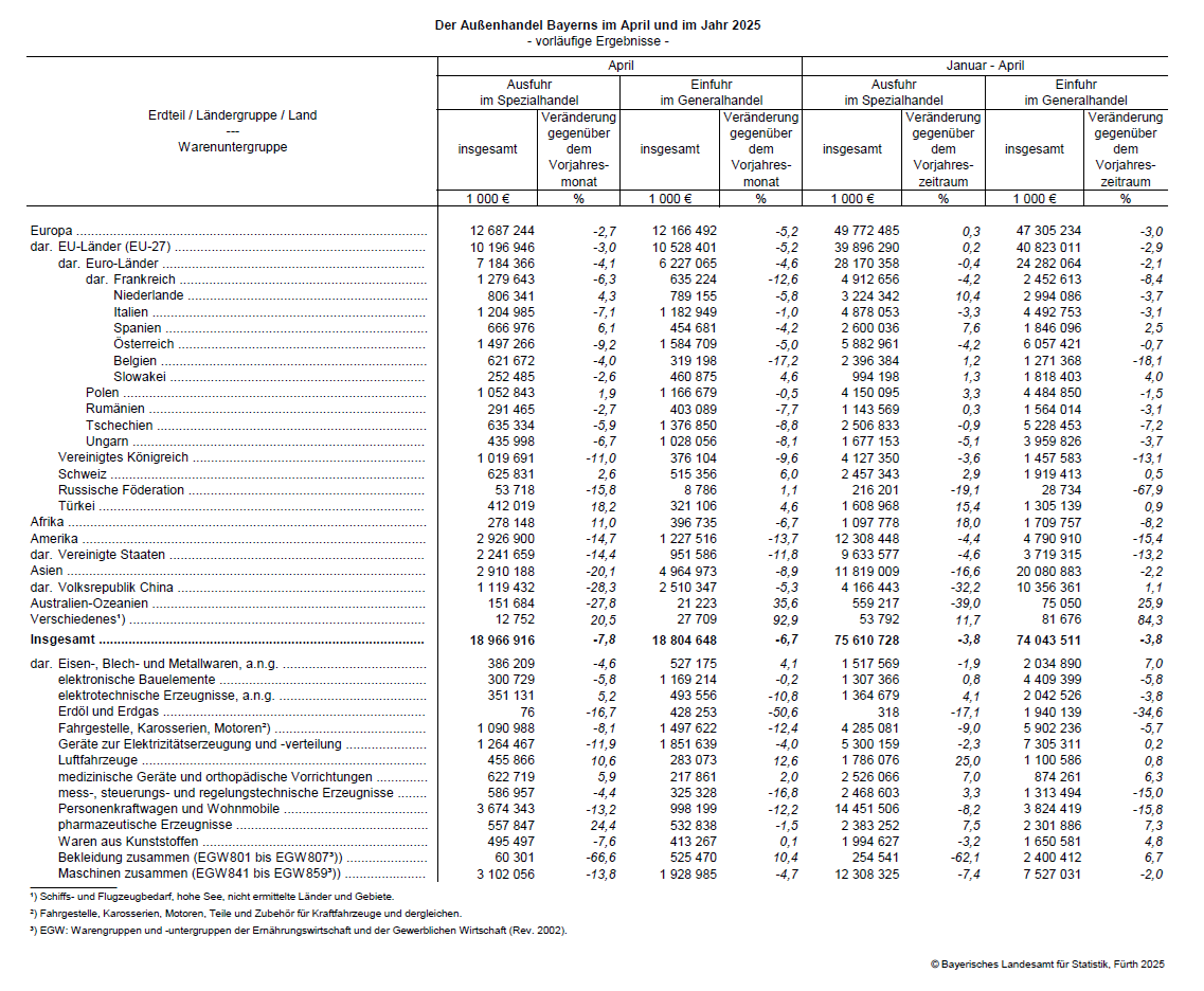 Nach den vorläufigen Ergebnissen des Bayerischen Landesamts für Statistik zur Außenhandelsstatistik erzielt die bayerische Wirtschaft im April 2025 Ausfuhren im Wert von 19,0 Milliarden Euro. Dies sind 7,8 Prozent weniger als im April 2024. Die Einfuhren nehmen zeitgleich um 6,7 Prozent auf 18,8 Milliarden Euro ab. Von Januar bis April 2025 sinken die Ausfuhren gegenüber dem Vorjahreszeitraum um 3,8 Prozent auf 75,6 Milliarden Euro. Die Einfuhren gehen um 3,8 Prozent auf 74,0 Milliarden Euro zurück.