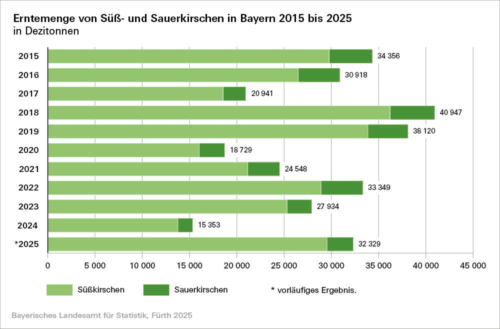 Fürth. Wie das Fachteam des Bayerischen Landesamtes für Statistik mitteilt, wird im Jahr 2025 in Bayern eine sehr gute Kirschenernte von rund 32 300 Dezitonnen erwartet. Da im vergangenen Jahr die endgültige Erntemenge aufgrund der widrigen Witterungsverhältnisse außergewöhnlich gering ausfiel (rund 15 300 Dezitonnen), deutet die diesjährige erste Schätzung mit einem Plus von 110,6 Prozent bzw. rund 17 000 Dezitonnen auf eine Verdoppelung des Vorjahresergebnisses hin.