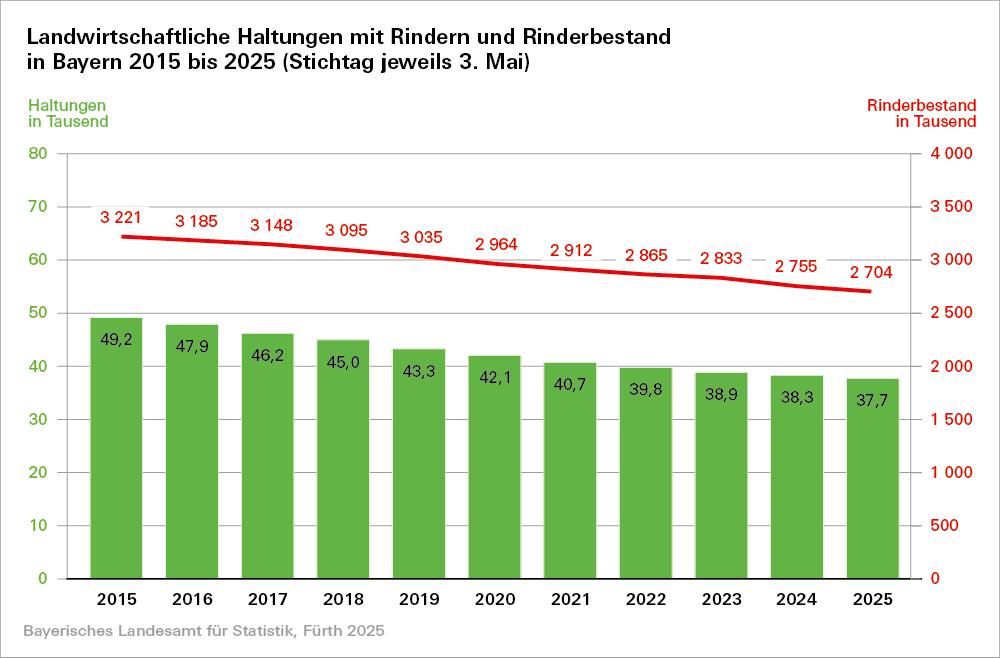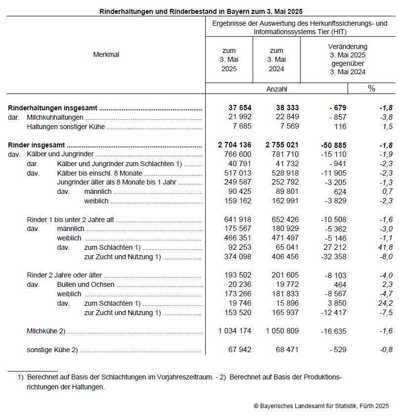 Fürth. Zum Stichtag 3. Mai 2025 weist das Fachteam des Bayerischen Landesamts für Statistik durch eine Auswertung des Verwaltungsverfahrens „Herkunftssicherungs- und Informationssystem Tier (HIT)“ 2 704 136 Rinder in 37 654 Haltungen nach. Die Zahl der Rinderhaltungen geht im Vergleich zum Vorjahr um 679 Haltungen zurück, das ist ein Minus von 1,8 Prozent. Der Rinderbestand verringert sich um 50 885 Tiere und sinkt damit ebenfalls um