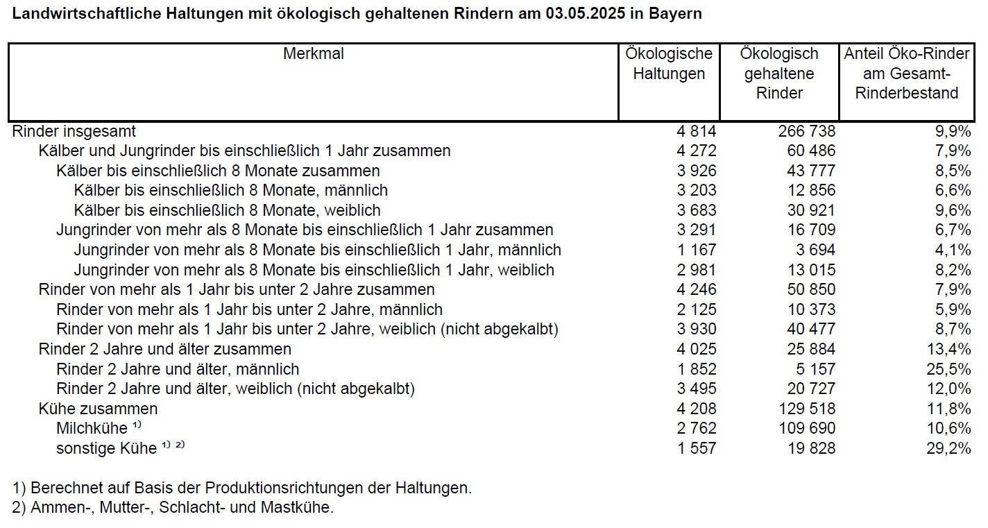 Erstmals in der Erhebung der Rinderbestände werden zum 3. Mai 2025 Rinderbestände mit Haltungskriterien des ökologischen Landbaus erfasst. In Bayern wird jedes 10. Rind und jede