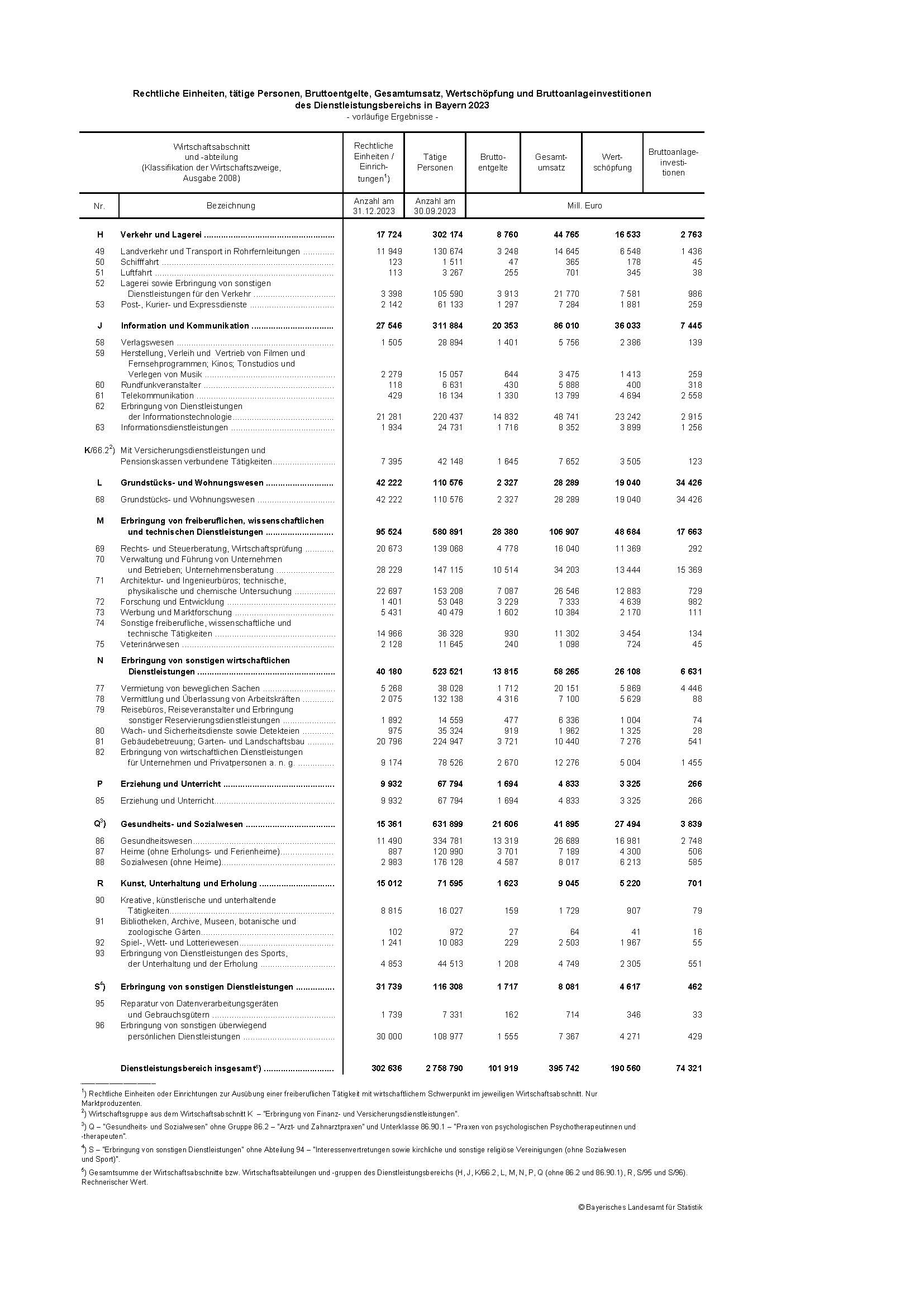 ¹ Hochgerechnete Ergebnisse; die Strukturstatistik im Handels- und Dienstleistungsbereich umfasst jährliche Erhebungen, die im Jahr 2023 im Dienstleistungsbereich in Bayern als Stichprobenerhebung bei 7,4 Prozent aller Erhebungseinheiten durchgeführt wurde. Die Erhebung erstreckt sich nur auf Marktproduzenten. Der Dienstleistungsbereich entspricht hierbei den Wirtschaftsabschnitten H, J, K/66.2, L, M, N, P, Q (ohne 86.2 und 86.90.1), R und S (ohne 94) der Klassifikation der Wirtschaftszweige, Ausgabe 2008. Durch das 2021 in Kraft getretene Handels- und Dienstleistungsstatistikgesetz (HdlDlStatG) wurden die drei bestehenden amtlichen Strukturstatistiken im tertiären Wirtschaftssektor – die Jahreserhebung im Handel, die Jahreserhebung im Gastgewerbe sowie die Strukturerhebung im Dienstleistungsbereich (SiD) – ab dem Berichtsjahr 2021 in die neu konzipierte Strukturstatistik im Handels- und Dienstleistungsbereich (SHD) integriert.