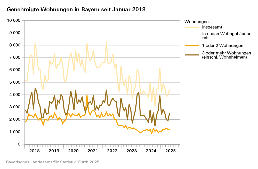 Von Januar bis Juni 2025 erteilen die Behörden in Bayern insgesamt 25 959 Baugenehmigungen für Wohnungen. Nach Auskunft des Bayerischen Landesamts für Statistik steigt das Genehmigungsvolumen im Vergleich zum ersten Halbjahr 2024 um