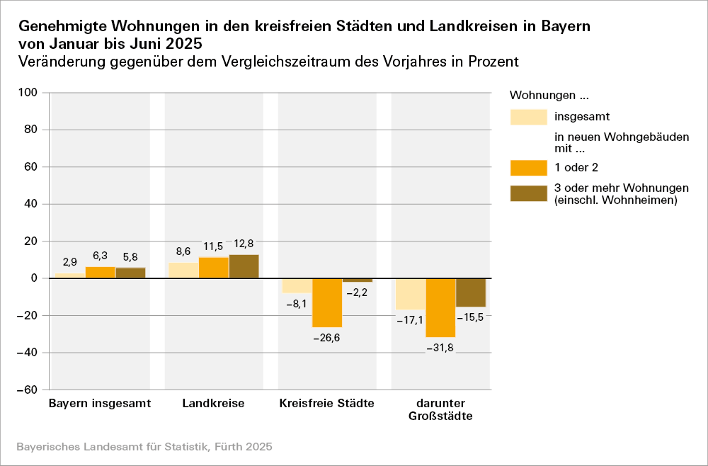 Regionale Unterschiede offenbaren sich bei der Trennung der bayerischen Kreise nach Stadt und Land: In den Landkreisen steigen die Wohnungsbaugenehmigungen um 8,6 Prozent. In den kreisfreien Städten verringert sich das Genehmigungsvolumen insgesamt um 8,1 Prozent, wobei in den Großstädten mit 17,1 Prozent der deutlichste Rückgang zu verzeichnen ist. Mit Blick auf die Regierungsbezirke verzeichnen Niederbayern, die Oberpfalz, Oberfranken und Mittelfranken deutliche Zuwächse um mehr als ein Drittel. In Unterfranken gibt es eine moderate positive Entwicklung mit 3,3 Prozent. In den südlichen Regierungsbezirken Oberbayern und Schwaben sinken die Genehmigungszahlen um 15,7 beziehungsweise