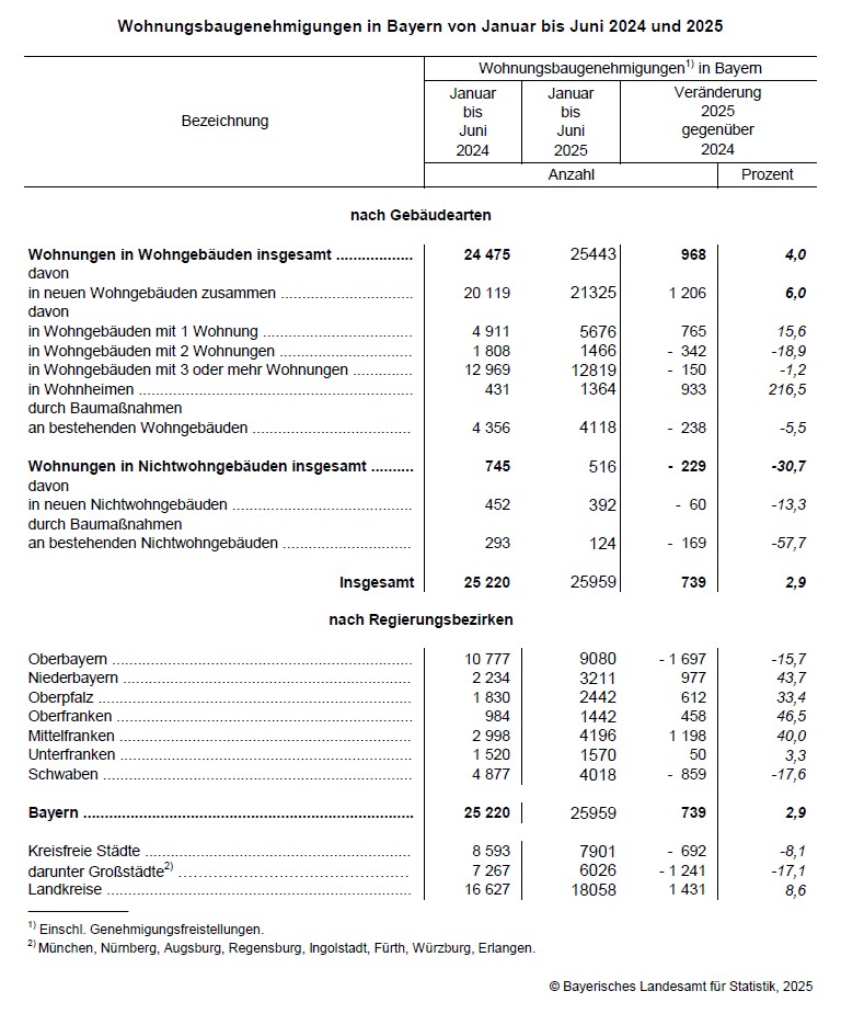 Schweinfurt. In Bayern werden von Januar bis Juni 2025 Baugenehmigungen (einschließlich Genehmigungsfreistellungen) für insgesamt 25 959 Wohnungen bewilligt. Nach Mitteilung der Fachgruppe im Bayerischen Landesamt für Statistik steigt die Zahl der Wohnungsbaufreigaben damit um 739 Wohnungen beziehungsweise 2,9 Prozent gegenüber dem ersten Halbjahr 2024.