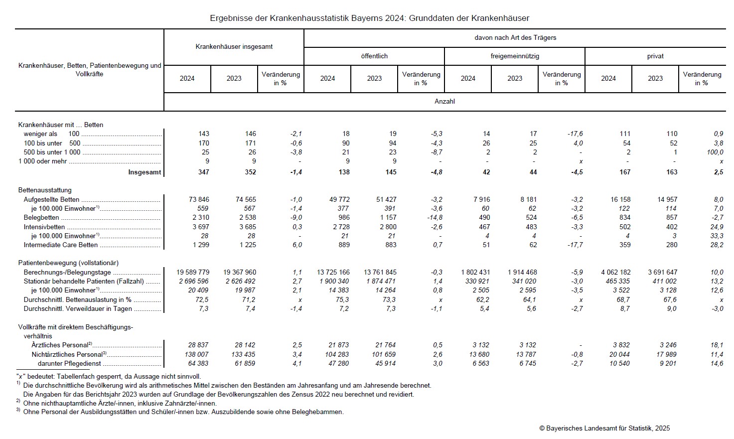 Nach Angaben des Bayerischen Landesamts für Statistik wurden im Jahr 2024 insgesamt 2,70 Millionen Patienten (Fallzahl) vollstationär in den 347 bayerischen Krankenhäusern behandelt. Die Anzahl der vollstationären Behandlungen steigt damit um 2,7 Prozent gegenüber 2023. Die Berechnungs- und Belegungstage im Jahr 2024 summieren sich auf 19,59 Millionen und liegen damit ebenfalls über dem Vorjahreswert (+1,1 Prozent). Die durchschnittliche Verweildauer pro Fall beläuft sich auf 7,3 Tage (Vorjahr 7,4 Tage).