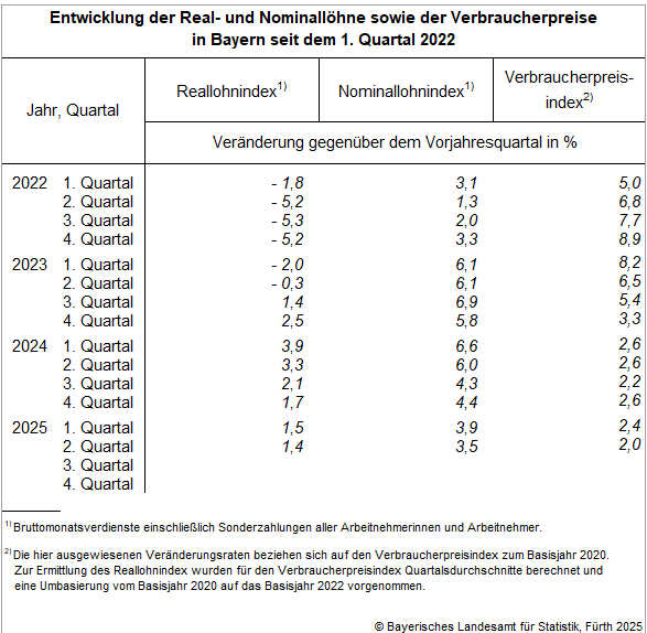 Fürth. Die nominalen Verdienste der Arbeitnehmerinnen und Arbeitnehmer in Bayern steigen im zweiten Quartal 2025 um durchschnittlich 3,5 Prozent gegenüber dem Vorjahresquartal. Die Verbraucherpreise nehmen im zweiten Quartal 2025 um 2,0 Prozent gegenüber dem Vorjahreszeitraum zu. Somit steigen die realen (preisbereinigten) Bruttomonatsverdienste einschließlich Sonderzahlungen aller Arbeitnehmerinnen und Arbeitnehmer im selben Zeitraum durchschnittlich um 1,4 Prozent. Damit setzt sich die positive Entwicklung der Reallöhne seit dem dritten Quartal 2023 weiter fort.
