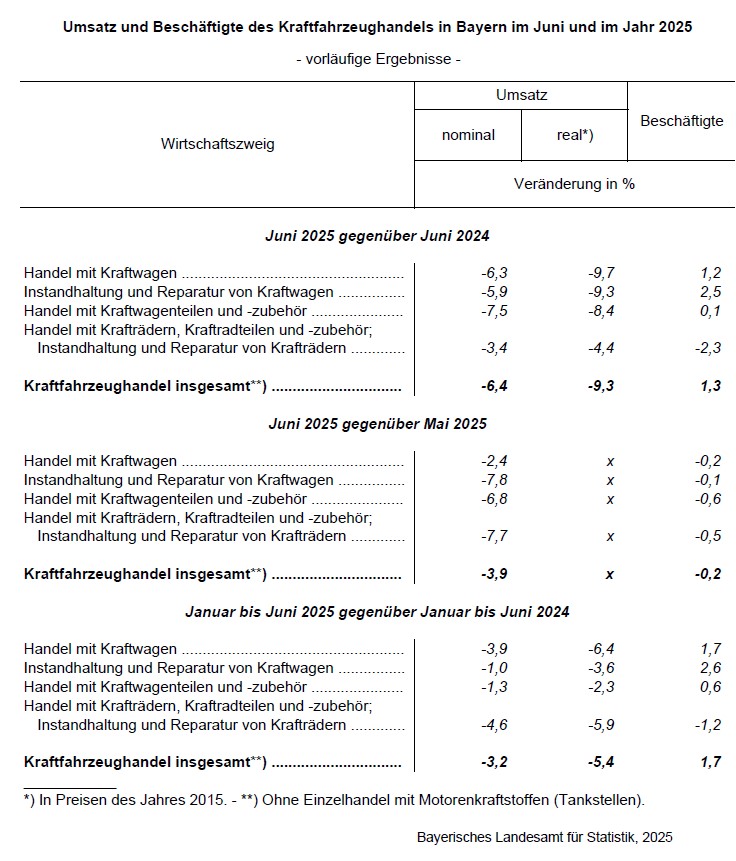 Nach einer Mitteilung des Bayerischen Landesamts für Statistik nach den vorläufigen Ergebnissen der „Monatsstatistik im Kfz-Handel (einschl. Instandhaltung und Reparatur von Kfz)“ sinkt der nominale Umsatz im bayerischen Kfz-Handel im ersten Halbjahr 2025 gegenüber dem Vorjahreszeitraum um 3,2 Prozent und der reale Umsatz um 5,4 Prozent. Die Zahl der Beschäftigten wächst um 1,7 Prozent.