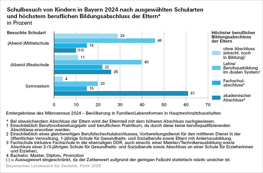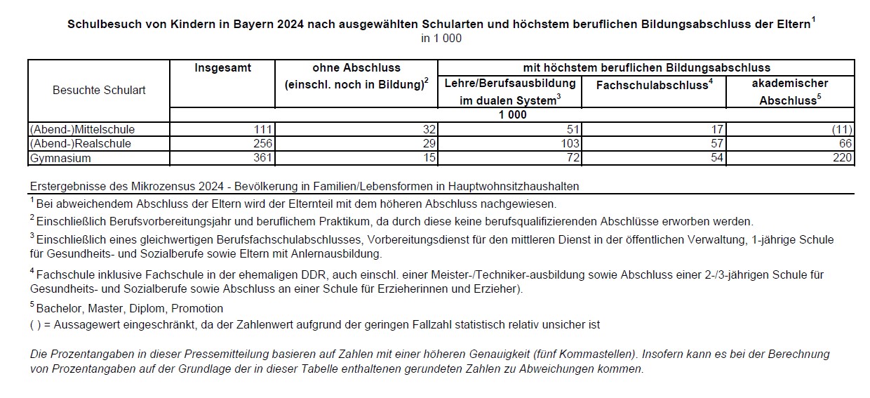 Erstergebnisse des Mikrozensus 2024 zeigen beim Bildungsweg von Kindern Parallelen zu dem der Eltern: Bei drei von vier Kindern am Gymnasium verfügen die Eltern über einen Fachschul- oder akademischen Abschluss – an der Mittelschule trifft dies auf eines von vier Kindern zu. Insgesamt besuchen rund 1,3 Millionen Schülerinnen und Schüler in Bayern eine allgemeinbildende Schule. Das entspricht zehn Prozent der bayerischen Bevölkerung. Die Ergebnisse unterschieden sich im Vergleich zum Vorjahr kaum.
