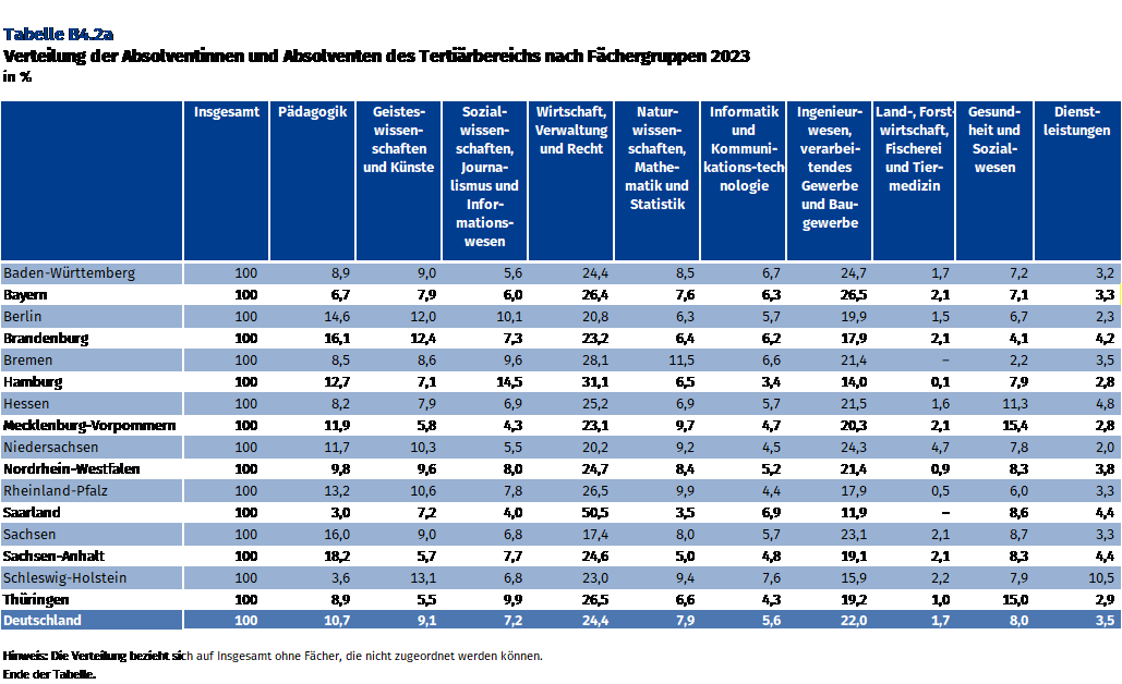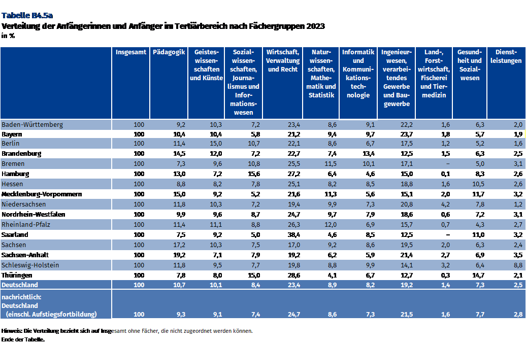 Deutliche Unterschiede im Ländervergleich zeigen sich 2023 auch in der Verteilung der Anfängerinnen und Anfänger im Tertiärbereich nach Fächergruppen. In Bayern wählen