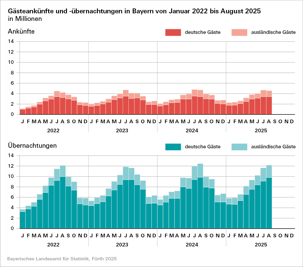 Die Übernachtungsrekorde aus dem August 2024 können im Jahr 2025 nicht erreicht werden. Knapp 1,2 Millionen internationale Reisende sind in Bayern zu Gast und übernachten gut