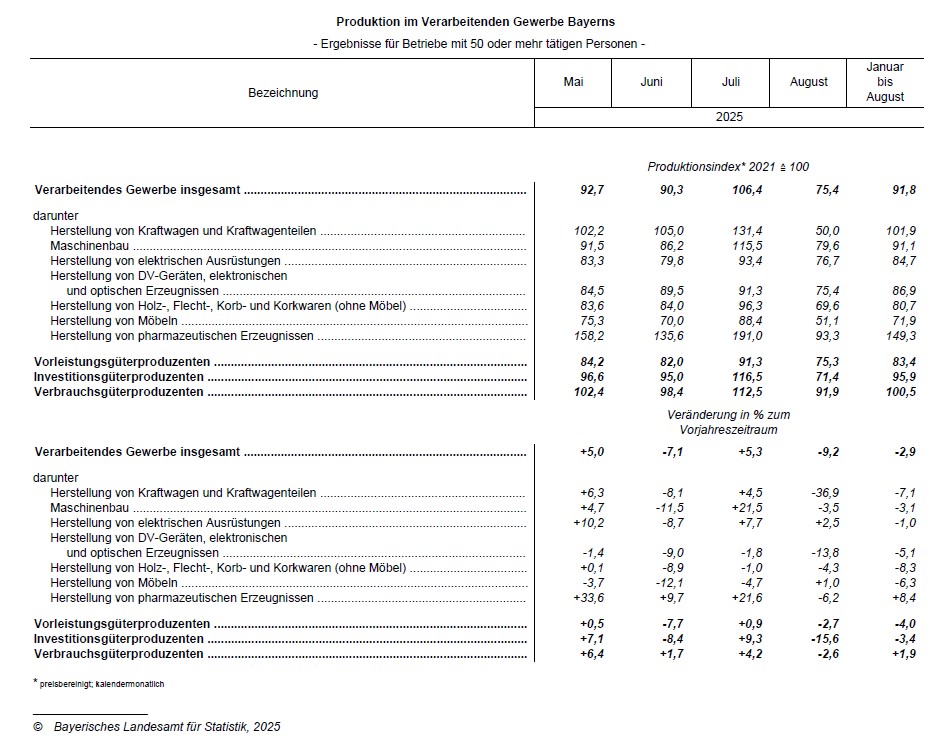Nach Angaben des Bayerischen Landesamts für Statistik verzeichnet die Produktion des Verarbeitenden Gewerbes in Bayern im August 2025 eine deutliche Abnahme von