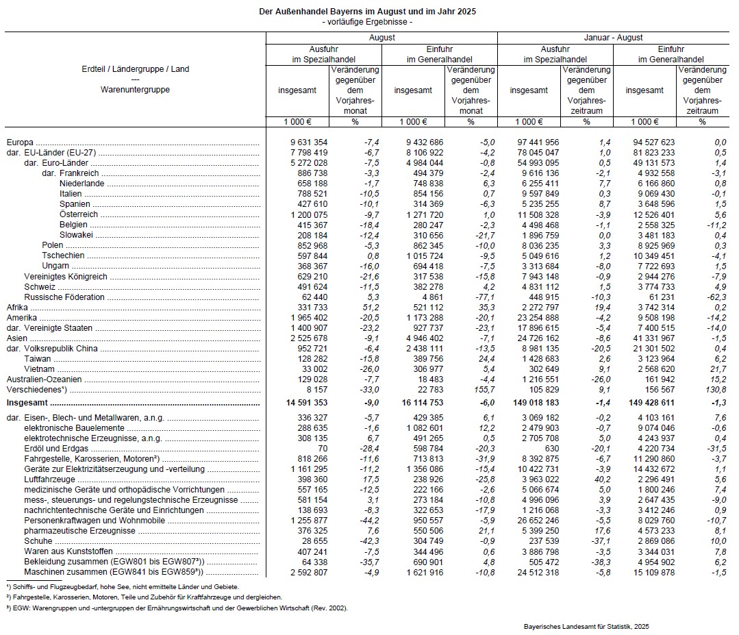 Laut vorläufigen Ergebnissen des Bayerischen Landesamts für Statistik zur Außenhandelsstatistik gehen die Ausfuhren der bayerischen Wirtschaft im August 2025 gegenüber dem Vorjahresmonat um 9,0 Prozent auf 14,6 Milliarden Euro zurück. Die Einfuhren sinken zeitgleich um 6,0 Prozent auf 16,1 Milliarden Euro. In den ersten acht Monaten 2025 nehmen die Ausfuhren gegenüber dem Vorjahreszeitraum um 1,4 Prozent auf 149,0 Milliarden Euro ab und die Einfuhren um 1,3 Prozent auf 149,4 Milliarden Euro.