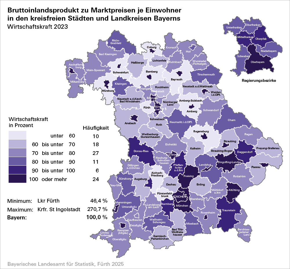 58 873 Euro. Die kreisfreie Stadt Ingolstadt verzeichnet mit einem Wert von 159 345 Euro pro Einwohner den höchsten Wert unter allen Landkreisen und kreisfreien Städten, gefolgt vom Landkreis München mit einer Wirtschaftskraft von 146 276 Euro pro Einwohner.