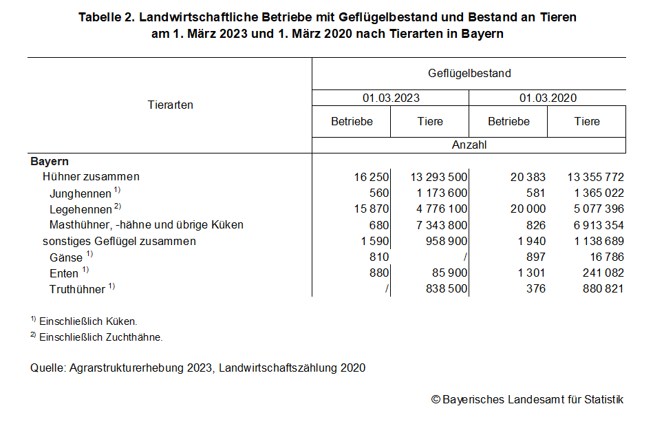 Hinsichtlich der Geflügelhaltung insgesamt liefern die Ergebnisse der repräsentativen Agrarstrukturerhebung 2023 derzeit die aktuellsten Ergebnisse. Demnach gibt es in Bayern zum Stichtag 1. März 2023 rund 16 250 Haltungen mit Hühnern und 1 590 mit sonstigem Geflügel (Gänse, Enten, Truthühner).