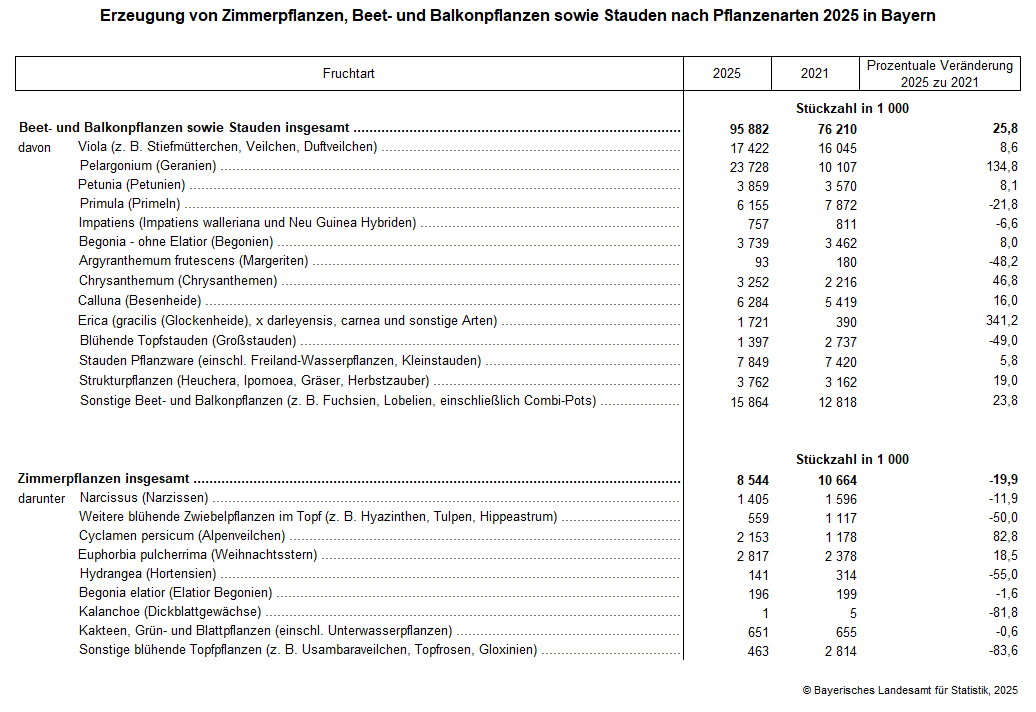 322 Gartenbaubetriebe erzeugen im Jahr 2025 insgesamt 95,8 Millionen (Mio.) verkaufsfertige Beet- und Balkonpflanzen sowie Stauden. Das sind 25,8 Prozent mehr als bei der letzten Erhebung im Jahr 2021. Mit 23,7 Mio. Stück und einem gewaltigen Plus von 134,8 Prozent gegenüber dem Jahr 2021 repräsentiert die Geranie (Pelargonium) inzwischen rund ein Viertel (24,7 Prozent) der Gesamtproduktion. Dahinter folgen Veilchen und Stiefmütterchen (Gattung Viola) mit 17,4 Mio. Stück, Stauden mit 7,8 Mio. Stück, die Besenheide (Calluna) mit 6,3 Mio. Stück und Primeln (Primula) mit 6,2 Mio. Stück. Die Erica (gracilis (Glockenheide), x darleyensis, carnea und sonstige Arten) kann mit 1,7 Mio. Stück einen beträchtlichen Zuwachs von 341,2 Prozent
