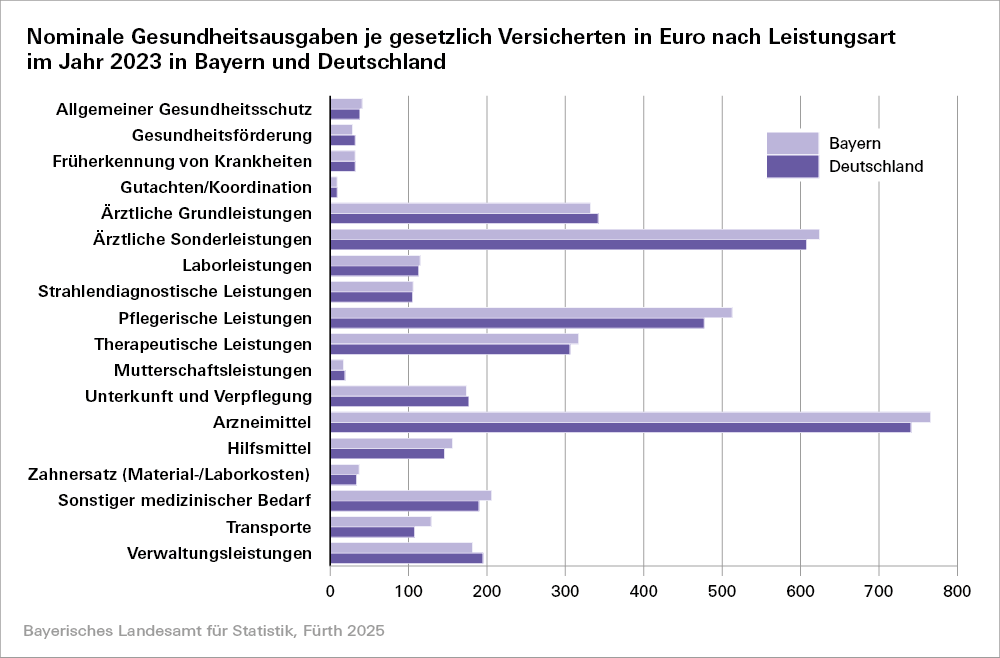 Mehr als ein Drittel der Kosten der gesetzlichen Krankenversicherung entfallen dabei auf ärztliche Leistungen. Dafür zahlt die gesetzliche Krankenversicherung in Bayern je Versicherten durchschnittlich etwa 1 169 Euro. Das ist etwa so viel wie im Bundesgebiet insgesamt. Davon entfallen etwa 342 Euro auf Grundleistungen, die die Basisversorgung und einfachere Untersuchungen umfassen. Den größten Anteil mit rund 608 Euro machen hingegen Sonderleistungen aus, die in der Regel spezialisierte Facharztbehandlungen und zusätzliche Maßnahmen beinhalten. Laboruntersuchungen und strahlendiagnostische Leistungen tragen mit jeweils etwa 113 Euro beziehungsweise 105 Euro ebenfalls wesentlich zu den Gesamtkosten bei1.