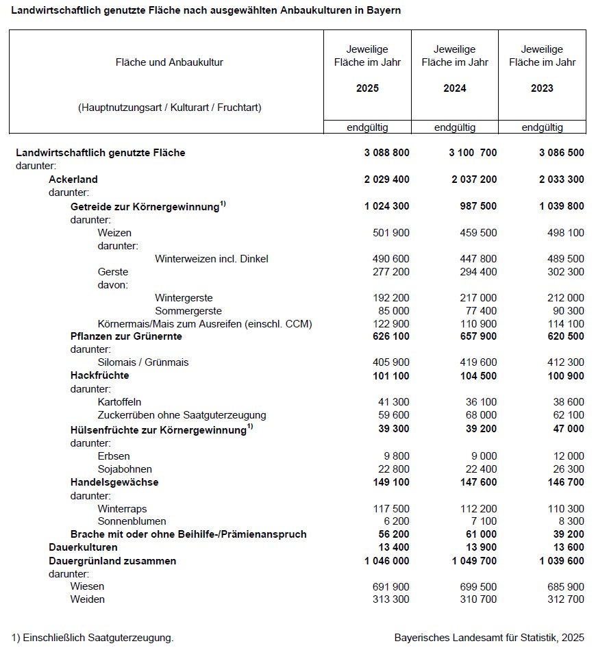 Nach Angaben des Bayerischen Landesamts für Statistik werden in Bayern laut den endgültigen Ergebnissen der Bodennutzungshaupterhebung im Jahr 2025 rund 3 088 800 Hektar landwirtschaftlich genutzte Fläche bewirtschaftet, darunter 2 029 400 Hektar Ackerland und 1 046 000 Hektar Dauergrünland. Auf gut der Hälfte des Ackerlandes wird Getreide zur Körnergewinnung angebaut.