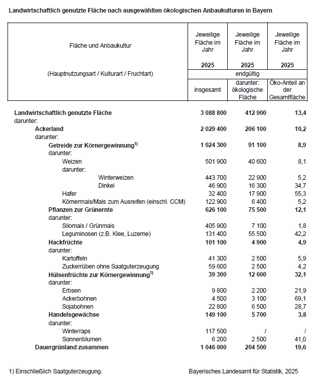 In Bayern werden 412 900 Hektar landwirtschaftlich genutzte Fläche nach den Kriterien des ökologischen Landbaus bewirtschaftet. Das ist ein Anteil von 13,4 Prozent an der gesamten landwirtschaftlich genutzten Fläche. Es handelt sich dabei um 206 100 Hektar Ackerland (10,2 Prozent des gesamten Ackerlands) und 204 500 Hektar Dauergrünland (19,6 Prozent des gesamten Dauergrünlands). Bei den folgenden Feldfrüchten überwiegt der ökologische Anbau den konventionellen Anbau: Ackerbohnen 69,1 Prozent und Hafer 55,3 Prozent. Weiterhin werden Leguminosen mit 42,2 Prozent, Sonnenblumen mit 41,0 Prozent und Dinkel mit 34,7 Prozent zu großen Teilen ökologisch angebaut.