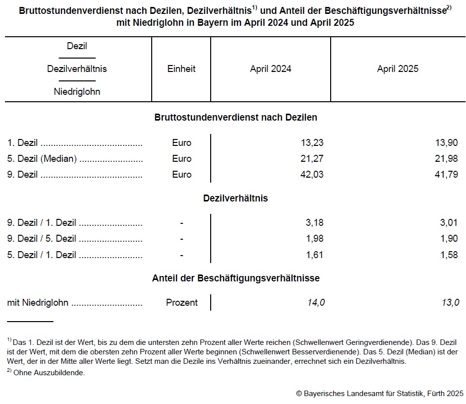 Im Zeitraum von April 2024 bis April 2025 sind die Bruttostundenverdienste der Geringverdienenden (am 1. Dezil) um 5,1 Prozent gestiegen. Dagegen sind die Bruttostundenverdienste der Besserverdienenden (am 9. Dezil) mit einem Minus von 0,6 Prozent leicht gesunken. Der mittlere Bruttostundenverdienst (5. Dezil bzw. Median), der von gleich vielen Beschäftigten unter- wie überschritten wird, beläuft sich in Bayern im April 2025 auf 21,98 Euro. Im Vergleich zum April 2024 (21,27 Euro) hat er um 3,3 Prozent zugenommen. Zum Vergleich: Der gesetzliche Mindestlohn ist im betrachteten Zeitraum um 3,3 Prozent gestiegen.