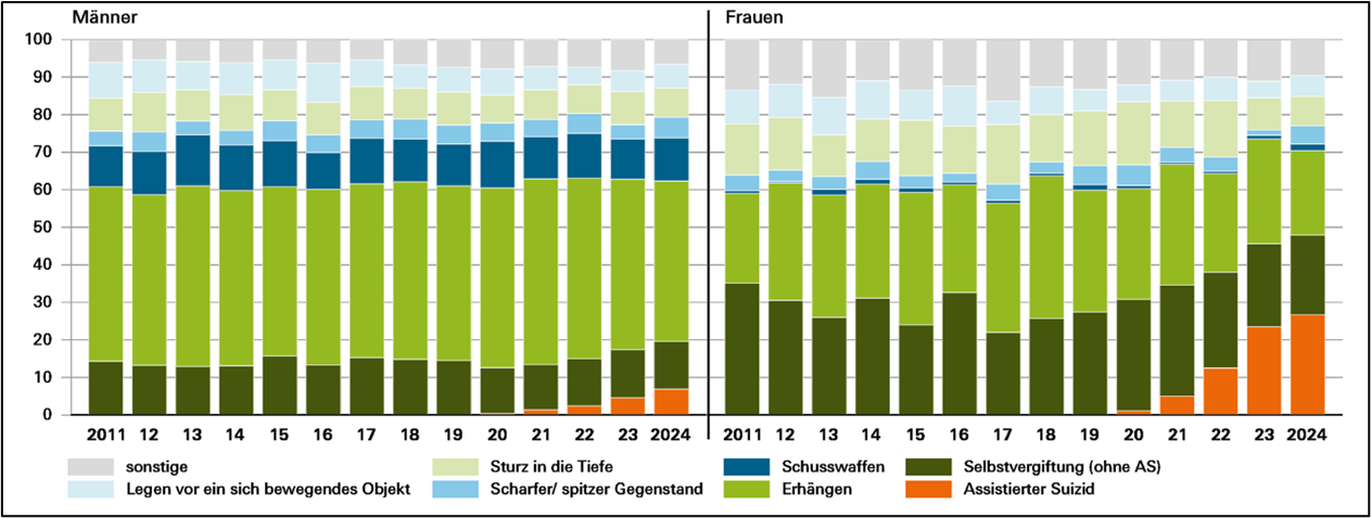 Ein Vergleich zwischen Frauen und Männern macht deutlich, dass Männer über die Zeit hinweg am häufigsten die Methode des Erhängens wählen. Zwischen 43 und 50 Prozent der männlichen Suizidenten entschied sich seit 2011 für diese Methode. Auch der Gebrauch von Schusswaffen ist bei Männern deutlich häufiger zu beobachten als bei Frauen. Frauen wählen neben der Methode des Erhängens häufiger einen Tod durch Sturz in die Tiefe oder durch Vergiftung – bis zum Jahr 2019 ohne ärztliche Hilfe, ab 2020 immer häufiger auch mit ärztlicher Assistenz. Im Jahr 2024 entschieden sich knapp 27 Prozent der weiblichen Suizidenten für einen assistierten Suizid.
