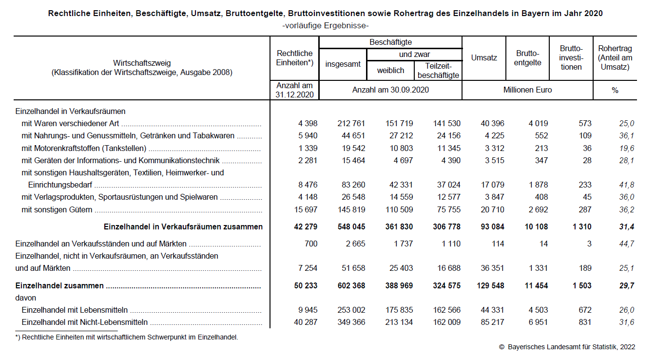 Ausführliche Ergebnisse enthält der in Kürze erscheinende Statistische Bericht „Unternehmensstruktur im bayerischen Binnen-handel - Ergebnisse der Jahreserhebung 2020“ (Bestellnummer: G1300C 202000). Weitere Informationen zum Bezug von Druckausgaben erhalten Sie beim Vertrieb per E-Mail (vertrieb@statistik.bayern.de), Telefon (0911 98208-6311) oder Fax (Fax-Nr. 0911 98208-6638).
