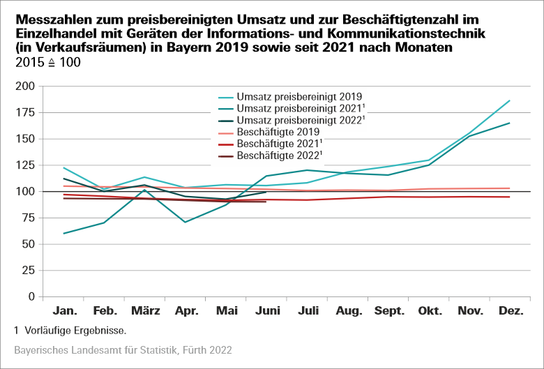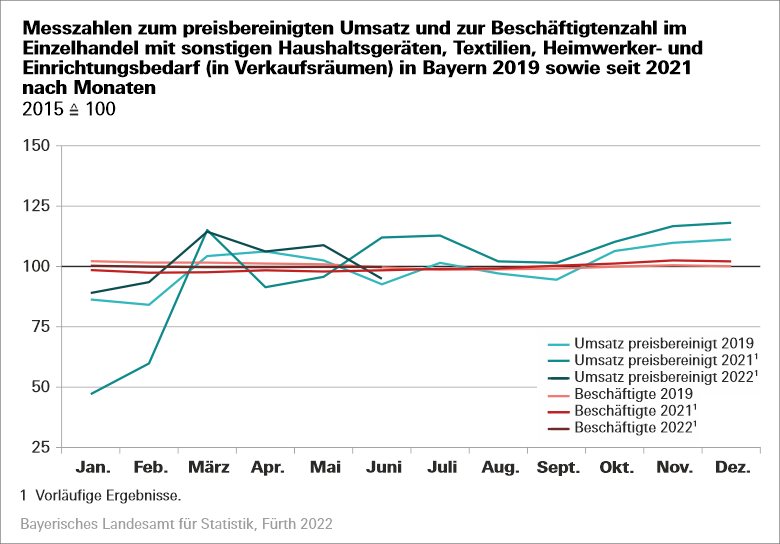 Beim Blick auf den Monat Juni 2022 sinkt im Vergleich zum Juni 2021 der nominale Umsatz des bayerischen Einzelhandels um 3,2 Prozent und der reale Umsatz um 10,7 Prozent. Während einige Wirtschaftsgruppen noch eine nominale Umsatzzunahme zum Vorjahresmonat verzeichnen, gehen die preisbereinigten Umsätze in allen Gruppen des bayerischen Einzelhandels zurück. Besonders hoch ist der reale Umsatzrückgang im Juni 2022 mit 16,5 Prozent im „Einzelhandel, nicht in Verkaufsräumen, an Verkaufsständen und auf Märkten“ und im „Einzelhandel mit Verlagsprodukten, Sportausrüstungen und Spielwaren (in Verkaufsräumen)“ sowie im „Einzelhandel mit sonstigen Haushaltsgeräten, Textilien, Heimwerker- und Einrichtungsbedarf (in Verkaufsräumen)“ mit jeweils 15,3 Prozent.