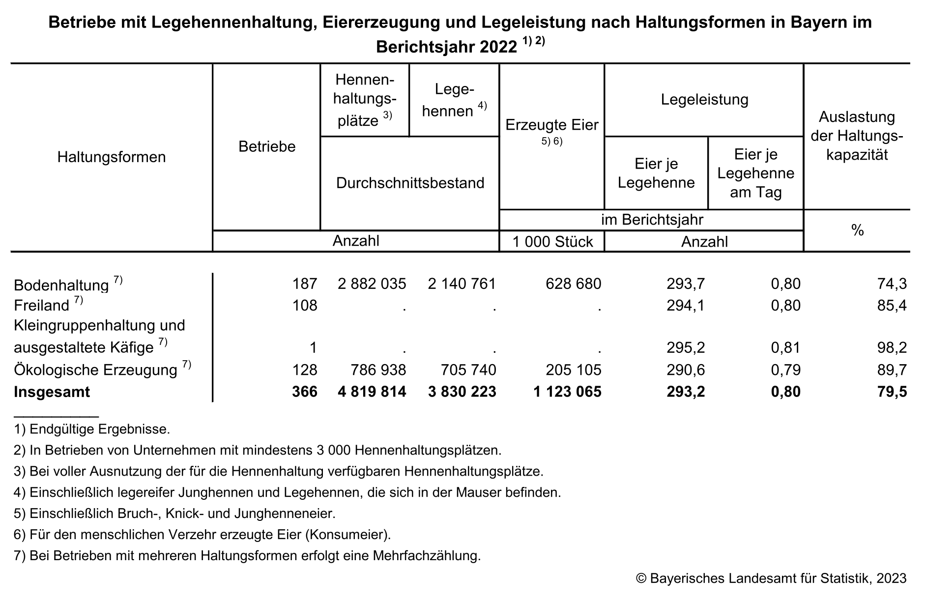 Betriebe mit Legehennenhaltung, Eiererzeugung und Legeleistung nach Haltungsformen in Bayern im Berichtsjahr 2022