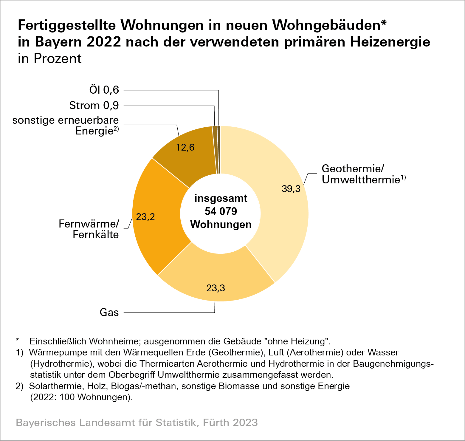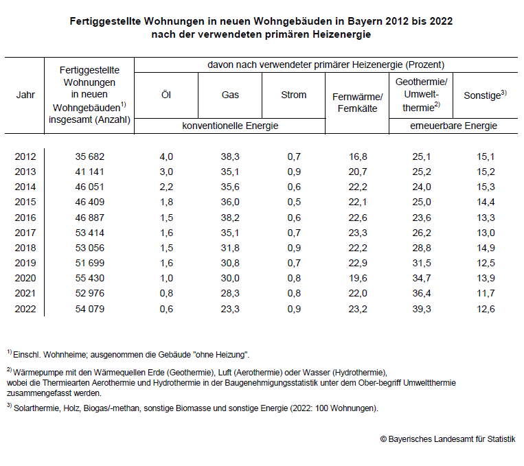 Die Verwendung erneuerbarer Heizenergie hat sich bei den fertiggestellten Wohnungen in neuen Wohngebäuden im Jahr 2022 gegenüber dem Vorjahr im Freistaat wieder erhöht. Mit insgesamt 52,0 Prozent wird nun in über der Hälfte der bezugsfertig gemeldeten Wohnungen im Wohnneubau erneuerbare Energie als primäre Heizenergie verwendet. Der Anteil dieser Wohnungen mit vorwiegender Nutzung von Wärmepumpen hat sich im Jahresvergleich von 36,4 Prozent auf 39,3 Prozent erhöht. Sonstige erneuerbare Energien als primäre Heizenergie, z.B. Solarthermie, Holz oder Biogas/-methan, haben sich anteilsmäßig von 11,7 Prozent auf 12,6 Prozent erhöht. Dagegen ist der entsprechende Anteil von Gas von 28,3 Prozent auf 23,3 Prozent gesunken.