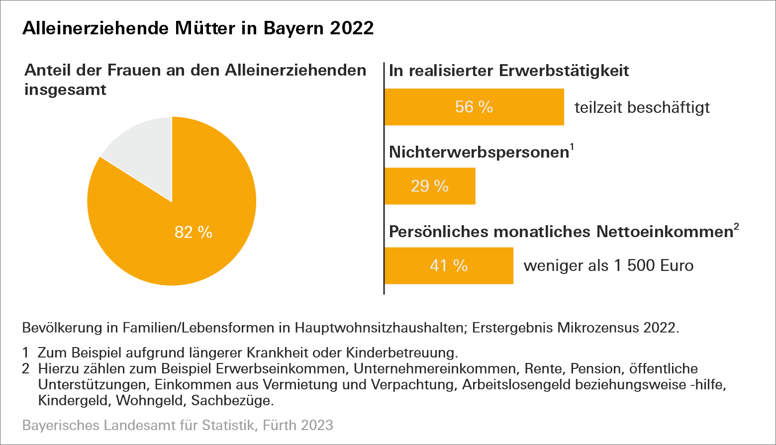 Nach Angaben des Bayerischen Landesamts für Statistik leben im Jahr 2022 in Bayern 1,9 Millionen Familien mit Kindern, darunter 390 000 Alleinerziehende. 82 Prozent der Alleinerziehenden sind Frauen. 41 Prozent der alleinerziehenden Mütter verfügen über ein monatliches Nettoeinkommen von weniger als 1 500 Euro. Mehr als die Hälfte (56 Prozent) der erwerbstätigen alleinerziehenden Mütter ist in Teilzeit beschäftigt.