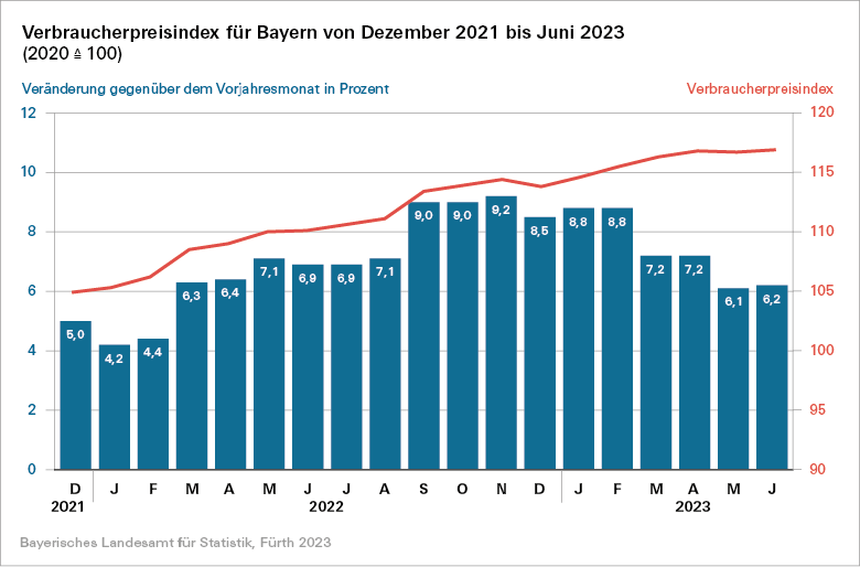 Die Inflationsrate, gemessen als prozentuale Veränderung des Verbraucherpreisindex für Bayern gegenüber dem entsprechenden Vorjahresmonat, liegt im Juni 2023 bei 6,2 Prozent.