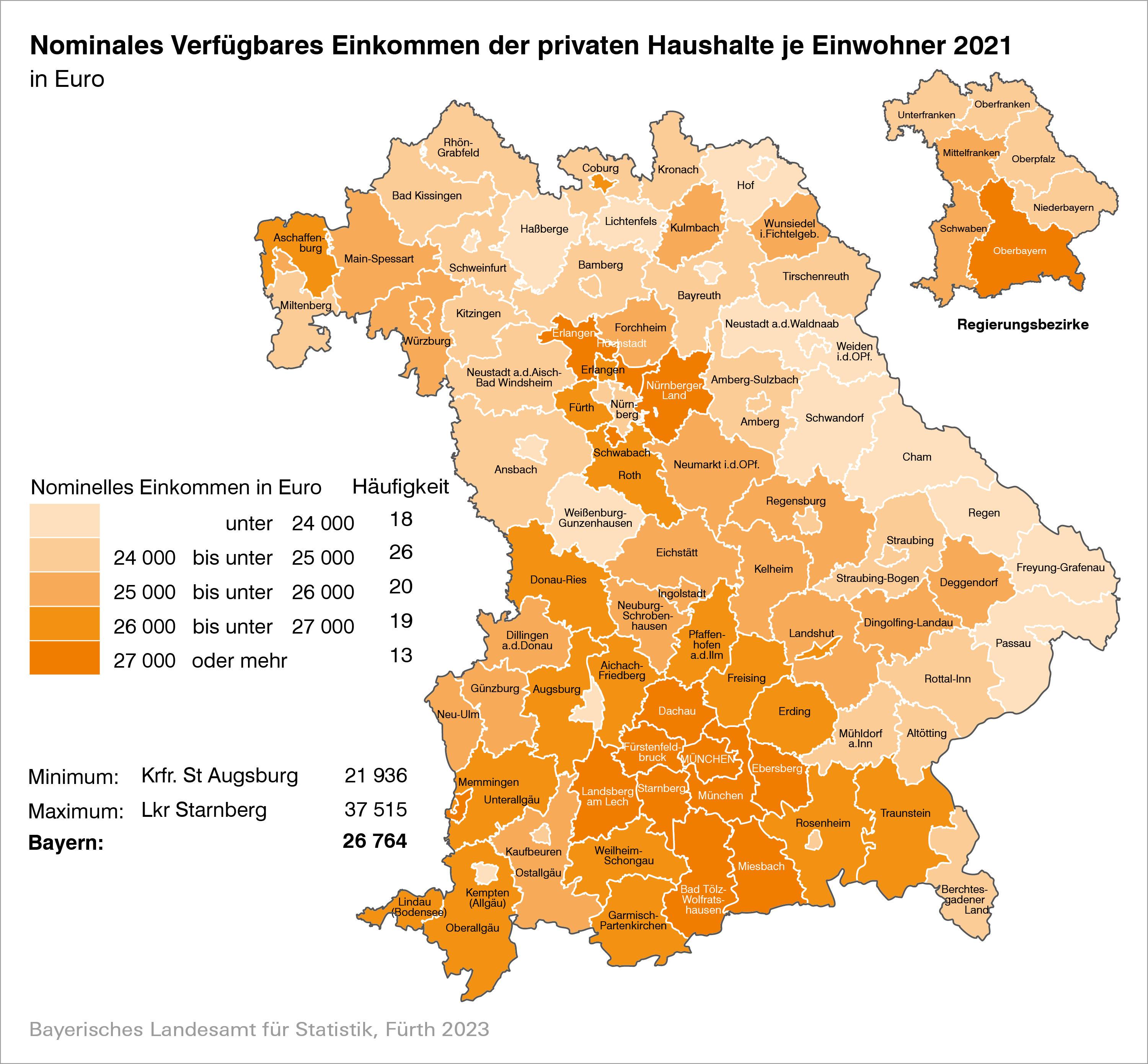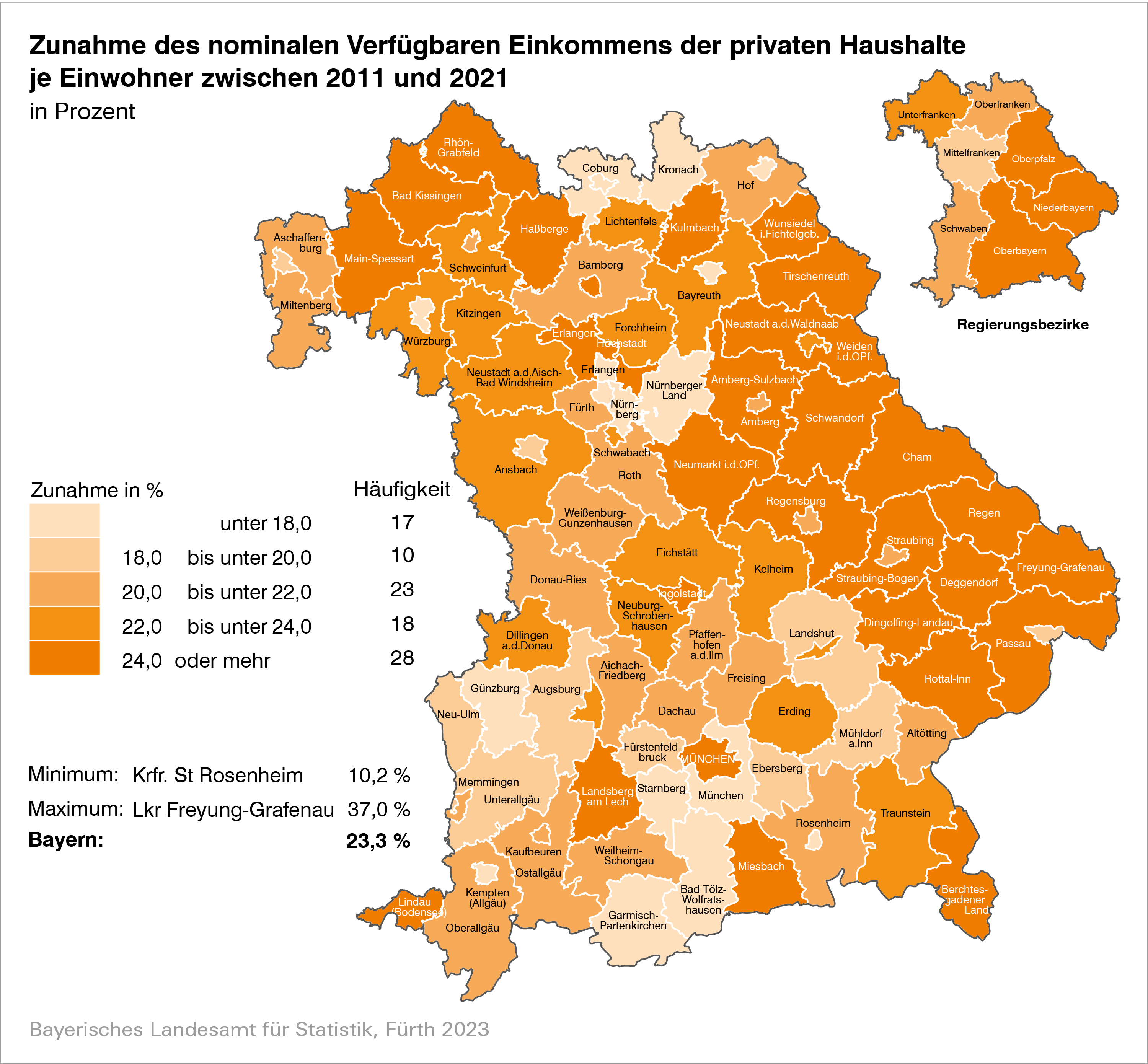 Das Verfügbare Einkommen der privaten Haushalte je Einwohner ist nach Meldung des Bayerischen Landesamts für Statistik im Zeitraum von 2011 bis 2021 in Bayern nominal um 23,3 Prozent gestiegen. Den stärksten Zuwachs erreichten unter den Regierungsbezirken Niederbayern und die Oberpfalz mit 26,6 bzw. 26,4 Prozent, gefolgt von Oberbayern mit 24,9 Prozent. In den meisten Regierungsbezirken ist das Verfügbare Pro-Kopf-Einkommen in den Landkreisen stärker gewachsen als in den kreisfreien Städten. Eine Ausnahme bildet Oberbayern, wo sich ein umgekehrtes Bild zeigt. Im Vergleich der 96 bayerischen Kreise hat sich das Einkommen im Landkreis Freyung-Grafenau und in der Stadt München mit 37,0 bzw. 34,6 Prozent am stärksten erhöht. Über das höchste nominale Jahreseinkommen je Einwohner verfügen im Jahr 2021 die privaten Haushalte in Starnberg mit durchschnittlich 37 515 Euro. An zweiter Stelle folgt die Stadt München mit durchschnittlich 34 036 Euro. In Bayern insgesamt beträgt der Durchschnittswert 26 764 Euro.