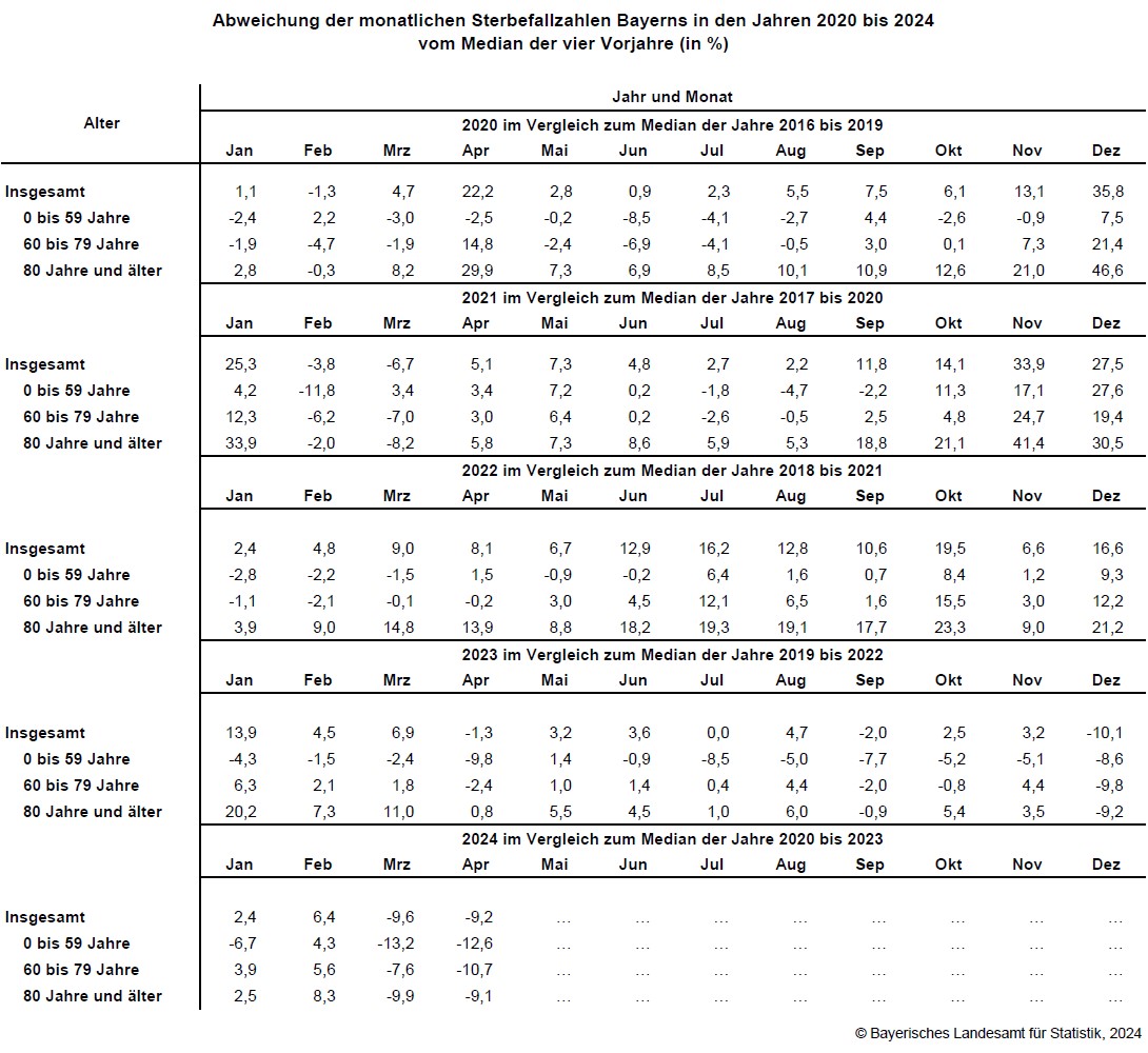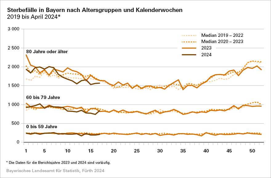 Bei Personen unter 60 Jahren verzeichnet das Bayerische Landesamt für Statistik im Betrachtungsmonat einen Rückgang der Sterbefälle um circa 13 Prozent. Bei der Gruppe der 60 bis unter 80-Jährigen und den 80-Jährigen und Älteren liegen die Sterbefallzahlen etwa elf Prozent bzw. neun Prozent unter dem Median der Jahre 2020 bis 2023.