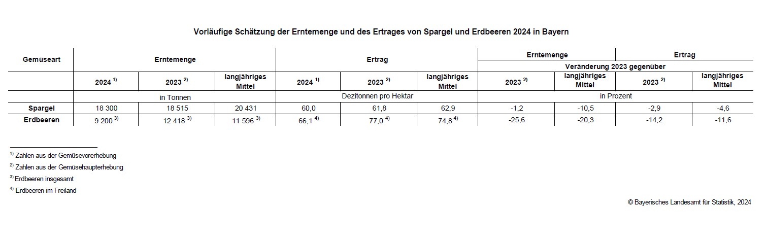 Die Gemüsevorerhebung liefert erste Aussagen zur bayerischen Spargel- und Erdbeerernte. Es handelt sich um vorläufige, hochgerechnete Ergebnisse. Die endgültigen Zahlen der Gemüsehaupterhebung werden voraussichtlich im Frühjahr 2025 vorliegen.