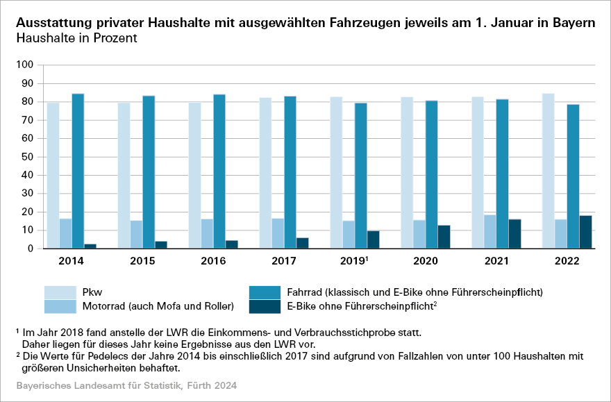 „klassischen“ Fahrrädern von etwa 84,5 Prozent auf 78,7 Prozent tendenziell abgenommen hat. Im Gegenzug ist der Anteil von Haushalten mit E-Bikes von 2,6 Prozent im Jahr 2014 auf 18,1 Prozent im Jahr 2022 gestiegen. So war bereits jeder sechste bayerische Haushalt im Jahr 2022 mindestens mit einem E-Bike ausgestattet. Wie geht diese Entwicklung weiter? Eine Antwort darauf und mehr zeigen die Ergebnisse der LWR 2024.