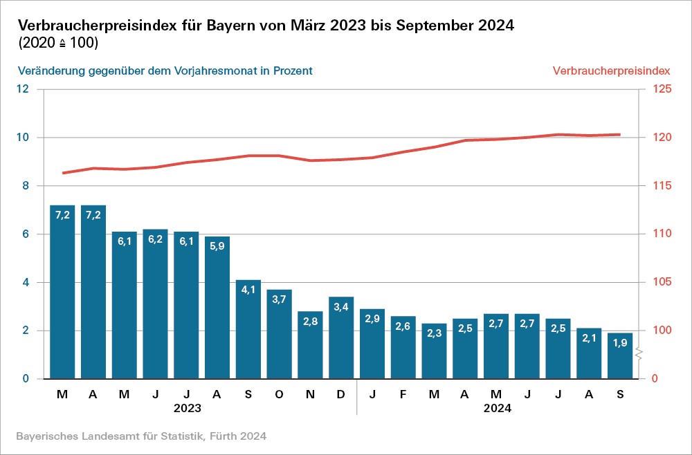 Fürth. Im Freistaat steigen die Verbraucherpreise im September gegenüber dem Vorjahresmonat um 1,9 Prozent. Unter 2 Prozent lag die Veränderungsrate zum Vorjahresmonat zuletzt vor mehr als drei Jahren im März 2021 (+1,8 Prozent). Dabei kosten Nahrungsmittel 1,6 Prozent mehr als im Vorjahr. Energie kann hingegen 6,8 Prozent günstiger bezogen werden. Zum Beginn des Oktoberfests verzeichnen die Expertinnen und Experten des Bayerischen Landesamts für Statistik eine Preissteigerung für ein Bier im Restaurant oder Café von 2,9 Prozent. Ein Fleischgericht im Restaurant oder Café wird sogar um 7,3 Prozent teurer. Bei Butter ist ein starker Preisanstieg von 24,2 Prozent zu beobachten.